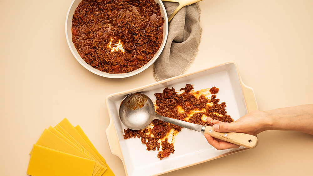 Kerrokset vuorottelevat niin, että jokainen suupala on tasapainoinen. Aloita aina ohuella kerroksella kastiketta vuoan pohjalle, jotta pastalevyt eivät tartu vuokaan. Sen jälkeen jatka vuorotellen kastikkeella ja pastalla.