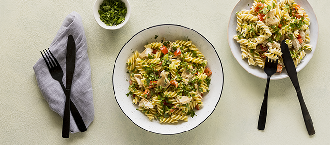 Torstai 22.1. Vegaanisen kanapastan juju ovat soijapalat ja kaurakerma, makua tuovat purjo ja paprika sekä tuore basilika.