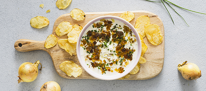 Ihanan umamisen karamellisoidun sipulin ja hieman hapokkaan ranskankerman yhdistelmä on täydellinen! Paista sipuleita miedolla lämmöllä, kunnes ne ovat kauniin ruskeita ja karamellisoituneita. Sekoita ranskankerman joukkoon karamellisoituneet sipulit sekä mausteet. Viimeistele dippi ruohosipulilla ja olet valmis dippailemaan!