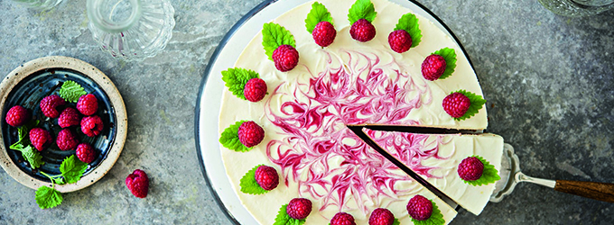 Vadelma-valkosuklaajuustokakku on kuin kaunein kesämorsian. Kakku kätkee sisäänsä herkullisen vadelmasydämen, ja vaatii leipojaltaan hieman kärsivällisyyttä, mutta lopputulos palkitsee taatusti.