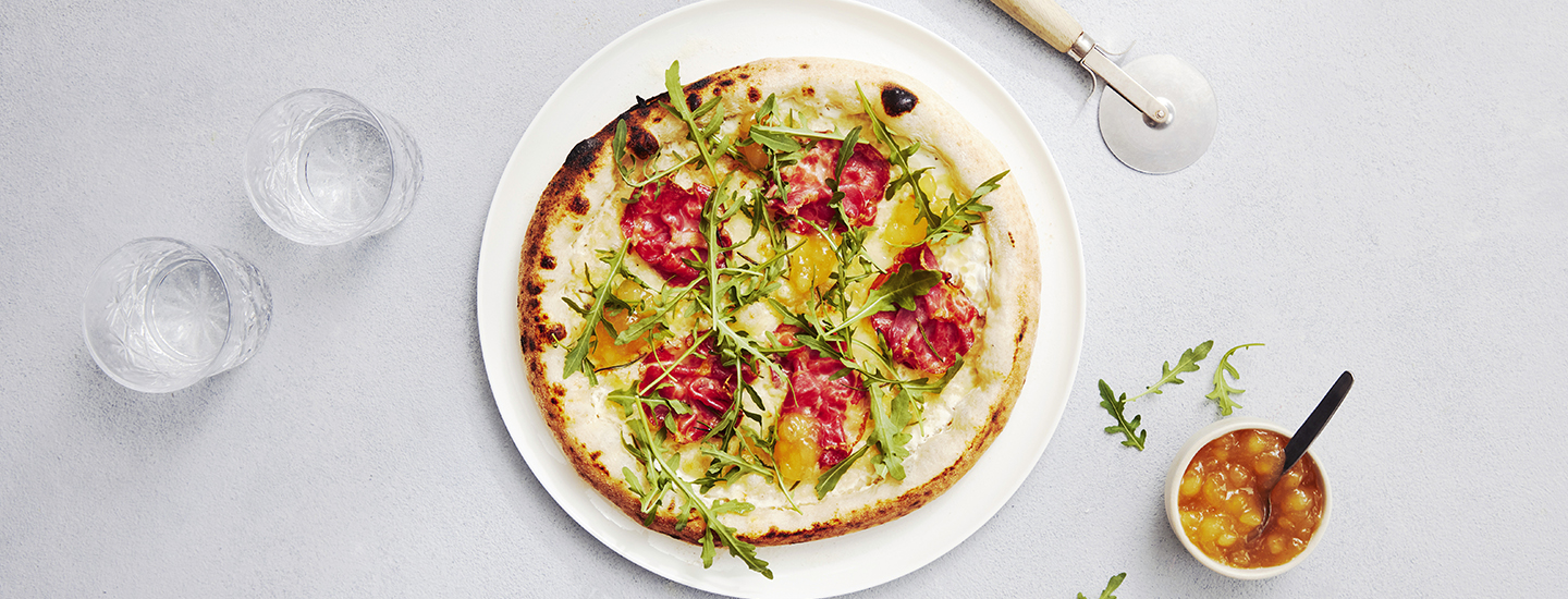 Kun haluat hieman erilaista pizzaa, kokeile valkoista kinkkupizzaa! Valkoisessa pizzassa tomaattikastikkeen sijaan pizzan päälle laitetaan limetinmehulla maustettua ranskankermaa. Ilmakuivatun coppa-kinkun lisäksi pizzassa maistuvat rosmariini, rucola ja omenahillo.