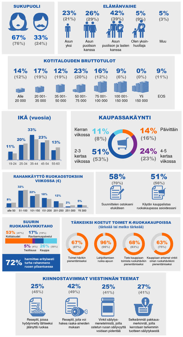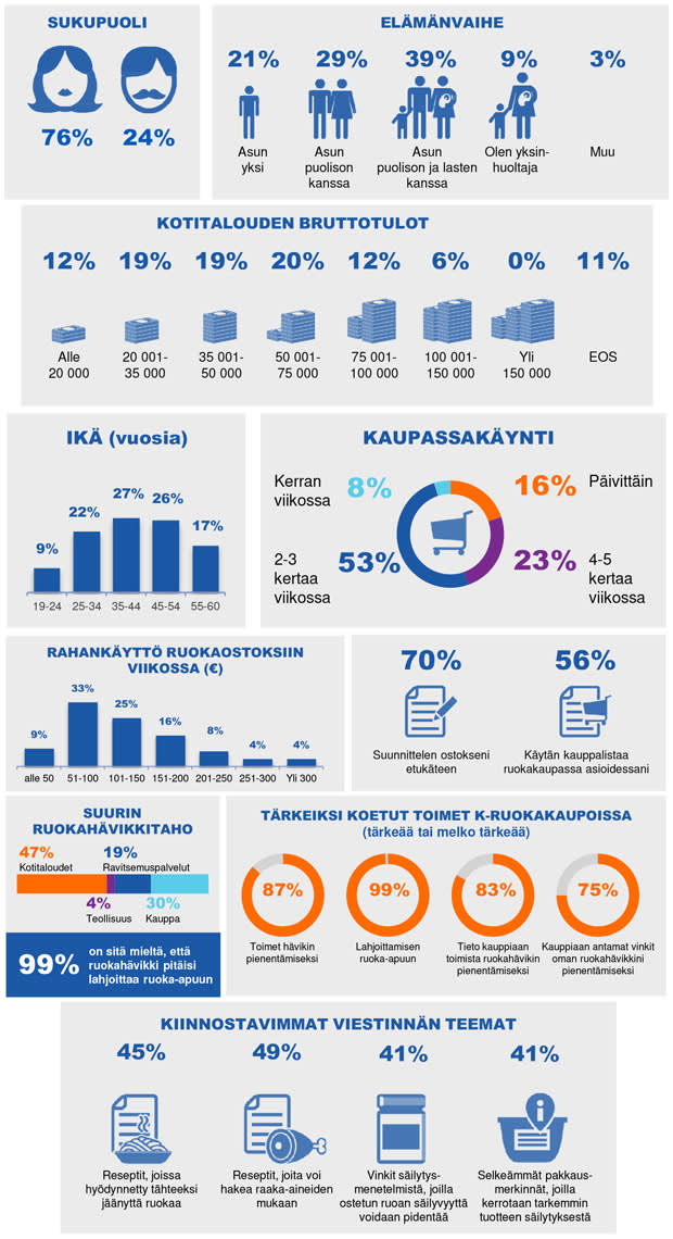 Profilointi-osiossa hyödynnettiin 466 vastaajan joukkoa. Vastaajat koostuivat eri-ikäisistä ja eri elämäntilanteissa elävistä henkilöistä. Heistä 75 % oli naisia. Vastaajista 99 % teki kokonaan tai osittain kotitalouden ruokaostokset. Heistä 53 % käy ruokakaupassa 2-3 kertaa viikossa ja rahaa viikon ruokaostoksiin käytetään useimmiten 50–100 euroa.