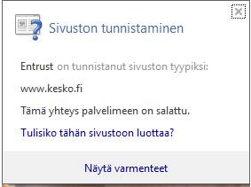 Keskon suomenkieliset sivut on suojattu Entrust-varmenteella. Useimmissa selaimissa varmennetta pääsee tarkastelemaan klikkaamalla lukon kuvaa. Kannattaa huomioida, että huijarit käyttävät myös varmenteita. Myös varmenteen tiedot pystyy usein tarkastamaan selaimessa.