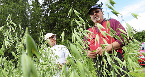 Loppukesällä viljelijä Mauri Ahola (oikealla) ja toimitusjohtaja Arsi Tiitinen odottivat kaurasta kelvollista satoa.