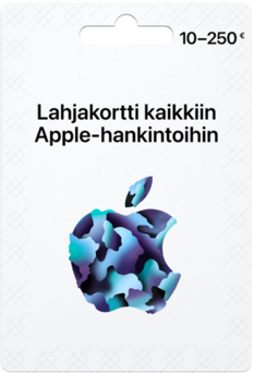 Lahjakortti kaikkiin Apple-hankintoihin. Applen ladattavan lahjakortin voit käyttää appeihin, peleihin, musiikkiin, elokuviin, TV-sarjoihin, kirjoihin, iCloudiin ja moniin muihin sisältöihin Applen ympäristössä. Voit käyttää kortin myös Applen laiteiden ja tarvikkeiden ostamiseen Applen verkkokaupassa. Kortin käyttö tapahtuu Applen tietokoneella, tabletilla tai älypuhelimella. Tutustu lahjakortin käyttöehtoihin Applen verkkosivuilla.