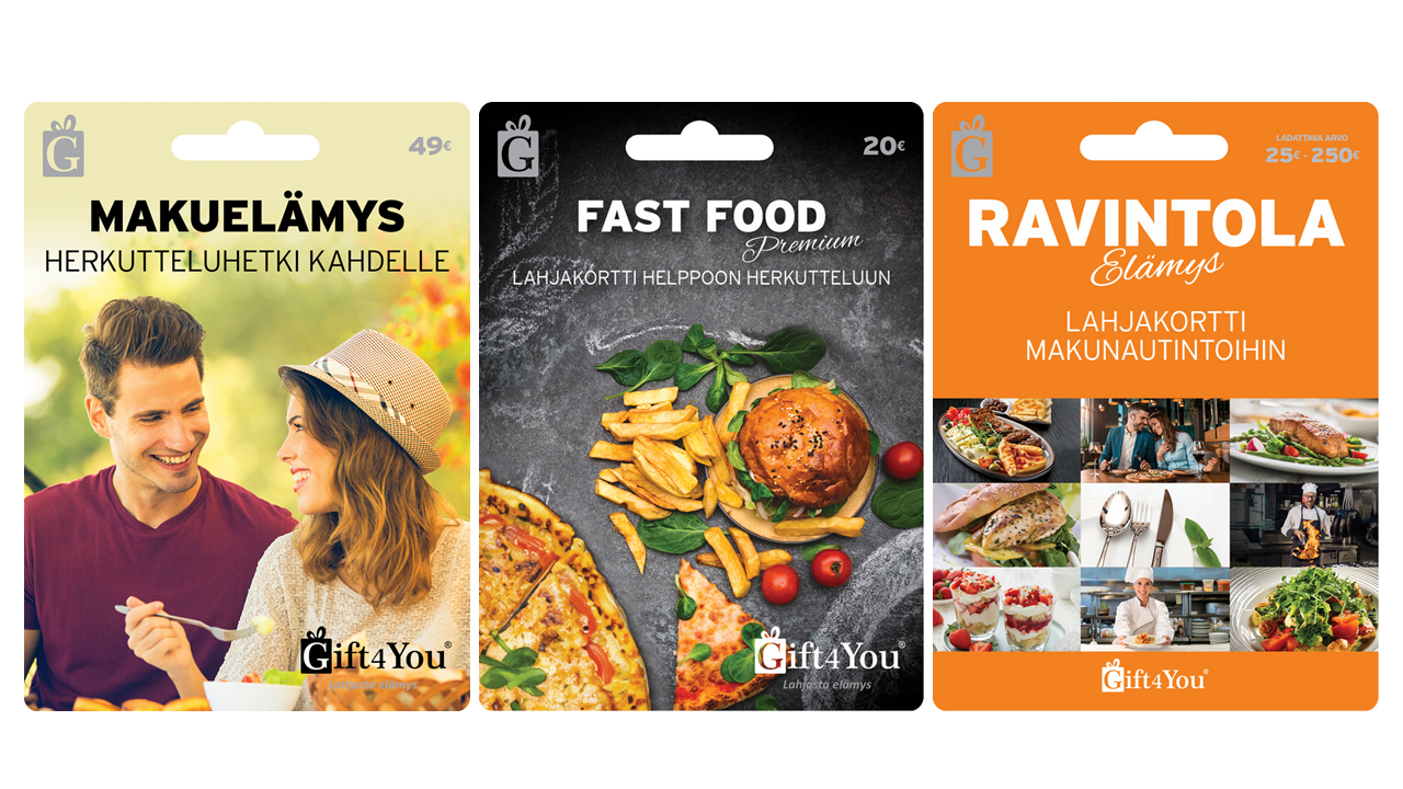 Herkuttelua - hauskanpitoa - hemmottelua - hyvinvointia! Lahja, joka sopii kaikille. Gift4You Kulta-lahjakortti on todellinen monitoimi-lahjakortti useisiin satoihin unohtumattomiin elämyksiin. Lahjan saaja voi valita haluamansa elämyksen satojen käyttökohteiden ja useiden satojen erilaisten palveluiden joukosta. Valittavana on monipuolinen valikoima elämyksiä mm. ravintoloiden ja kahviloiden tarjoamien makunautintojen, toiminnallisten ja liikunnallisten aktiviteettien, seikkailu- ja harrastepuistojen tarjoamien huvitusten sekä lukuisten muiden ajanviete-, kulttuuri-, hyvinvointi- ja wellness-palveluiden parissa kautta maan. ›› Tutustu tarkemmin
