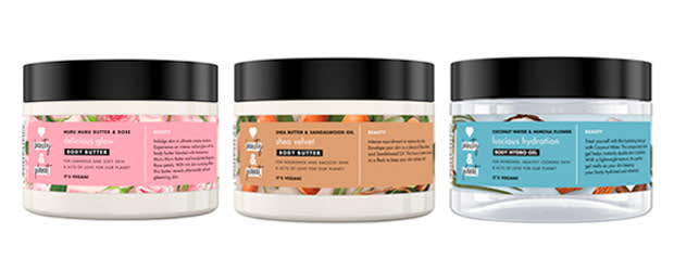 Love, Beauty and Planet -ihonhoitotuotteisiin kuuluvat vegaanisertifioidut hoitavat ja kosteuttavat vartalovoiteet, vartalovoit ja vartalogeeli, kasvojen hellävarainen puhdistusaine ja kasvokuorinta sekä hoitavat ja virkistävät kasvonaamiot. Love Beauty and Planet -ihonhoitotuotteet eivät sisällä parabeeneja eivätkä väriaineita. Lisäksi vartalovoiteissa ei ole silikonia. Mitkään Love Beauty and Planet -kuorintatuotteet (vartalon tai kasvojen kuorinta) eivät sisällä muovisia mikrohelmiä.