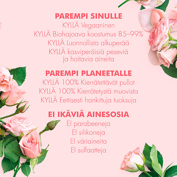 - Blooming Colour, shampoo ja hoitoaine. Sisältää luonnollista Amazonian Murumuru voita ja tuoksussa eettisesti hankittua Bulgarian ruusua. 400 ml.