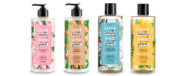 Love Beauty and Planet suihkugeelit hoitavat ihoa luonnollisilla ainesosilla ja jättävät iholle pehmeän tunteen sekä raikkaan täyteläisen tuoksun. Tuotesarjaan kuuluu neljä eri vegaanisertifioitua suihkugeeliä, jotka eivät sisällä sulfaattipohjaisia puhdistavia ainesosia, parabeeneja tai väriaineita.