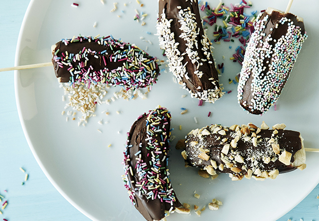 Tee banaanitikkarit valmiiksi tai anna lasten kasata omansa pienenä juhlien ohjelmanumerona. Banaanitikkarit muuttuvat raikkaiksi banaanijädeiksi pakastamalla tikkuihin pujotetut banaanipalat ennen koristelua sekä sen jälkeen. Ei hassumpi välipalaidea kuumana kesäpäivänä!