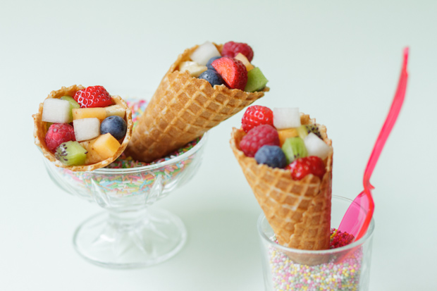Veikeät vohvelitötteröt ovat kevyempi vaihtoehto jäätelölle. Pilko synttärisankarin lempihedelmiä sekä -marjoja suuhun sopiviksi paloiksi ja lusikoi tötteröihin. Makeat makupalat sujahtavat helposti suuhun ja maistuvat herkullisilta vohvelikuoren kanssa nakerrettuina!