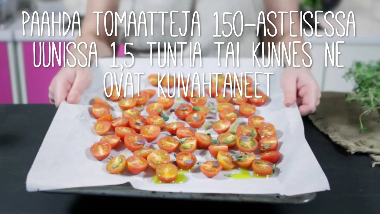 Uunikuivatut tomaatit sopivat esimerkiksi pastakastikkeen tai tomaatti-parsasalaatin sekaan, mutta niistä syntyy myös täyteläinen tomaattikeitto. Kokeile reseptejä, ohjevideon vinkeillä paahtaminen käy helposti.
