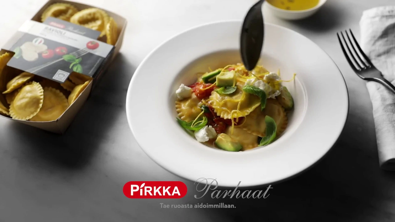 Tuoreet valmisraviolit ovat nopeaa ruokaa, joiden keittoaika on vain 3–4 minuuttia. Pirkka Parhaat -ravioleja on tällä hetkellä tarjolla K-kaupoissa kolmea erilaista. Yhdessä on täytteenä täyteläisiä kantarelleja, toisessa suussa sulavaa ricottaa ja pinaattia sekä kolmannessa tomaattia, mozzarellaa ja basilikaa. Raviolien seuraksi sopii hyvin Pirkka Parhaat Parmigiano Reggiano parmesan.