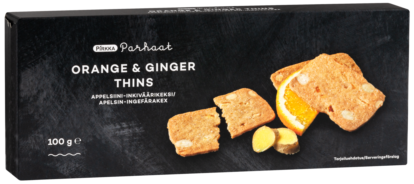 Pirkka Parhaat keksilajitelma juustoille on kuuden erilaisen keksin valikoima. Se sopii erityisesti tarjottavaksi juustojen, hillon ja tuoreiden hedelmien seuraksi. Pirkka Parhaat orange ginger thins -keksit ovat ihanan ohuita voilla leivottuja mantelikeksejä, joissa maistuvat raikkaasti appelsiini ja inkivääri. Sopivat kahvipöytään tai herkutteluhetkeen ihan sellaisenaan. Kokeile myös hillojen, jäätelön ja makeiden tuorejuustojen kanssa sekä jälkiruokien ja leivonnaisten koristeluun.