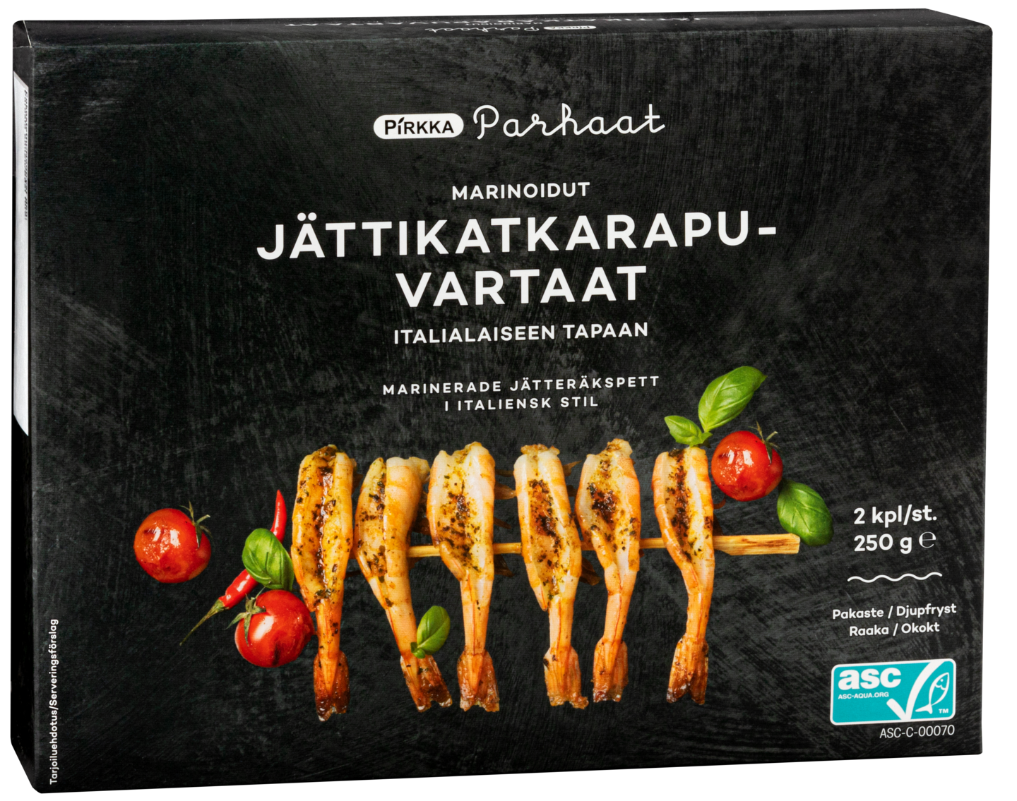 Nopeasti valmistuvat italialaisittain maustetut Pirkka Parhaat jättikatkaravut on pujotettu valmiiksi vartaisiin. Italialaisittain persiljalla ja basilikalla maustetut vartaat voi nostaa suoraan pakkauksesta uuniin tai sulatuksen jälkeen grilliin kypsymään. Tarjoa vartaat sellaisenaan tai raikkaan salaatin kera. Jättikatkarapuvartaat on saatavilla myös ranskalaiseen tapaan persiljalla ja kirvelillä maustettuna.
