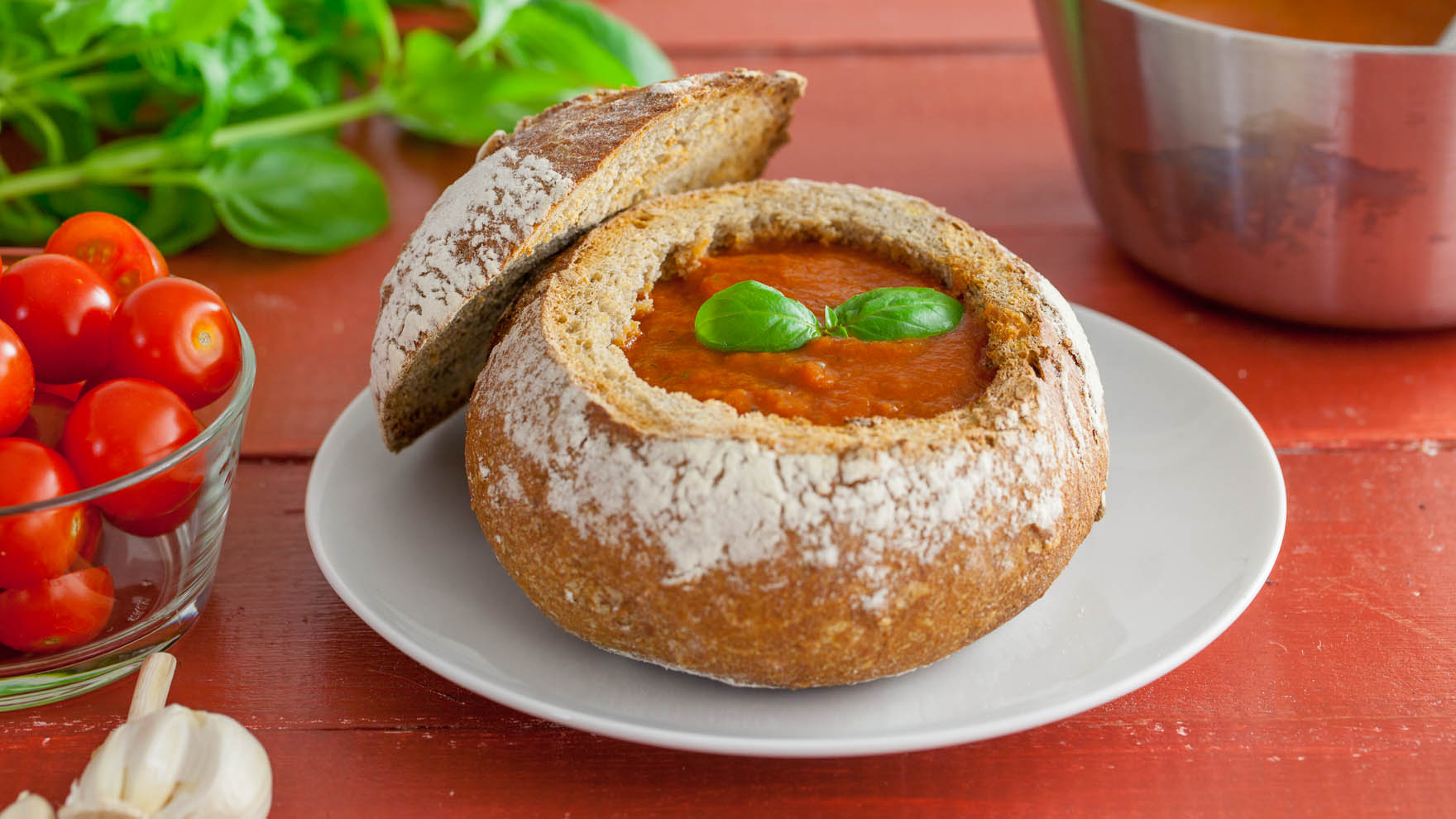 Leipäkuoresta tarjottava kuuma keitto on näyttävä ruoka illanistujaisiin. Koverra keittoa varten yksi iso leipä tai jokaiselle ruokailijalle pienempi keittosämpylä.