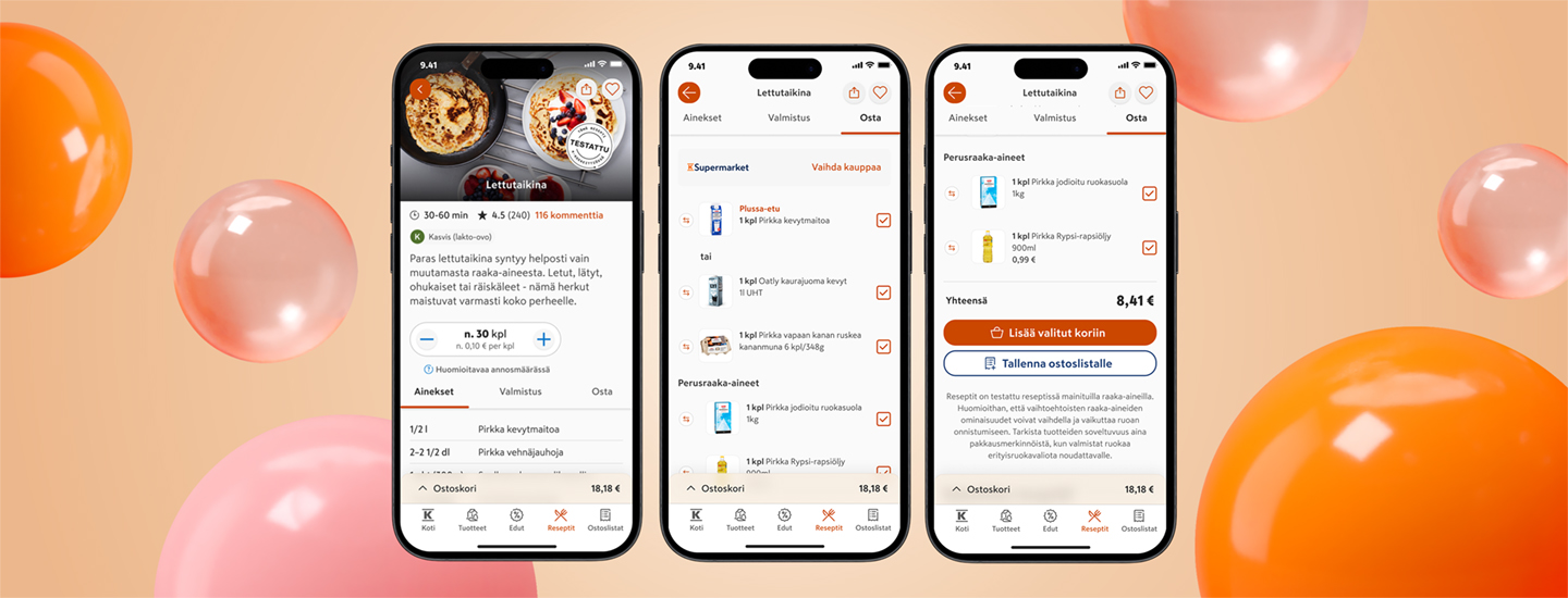 Helpota ruoanlaittoa ja hyödynnä K-Ruoka-sovelluksen uutta reseptiominaisuutta, jolla saat reseptin raaka-aineet verkkokaupan ostoskoriin yhdellä napautuksella!