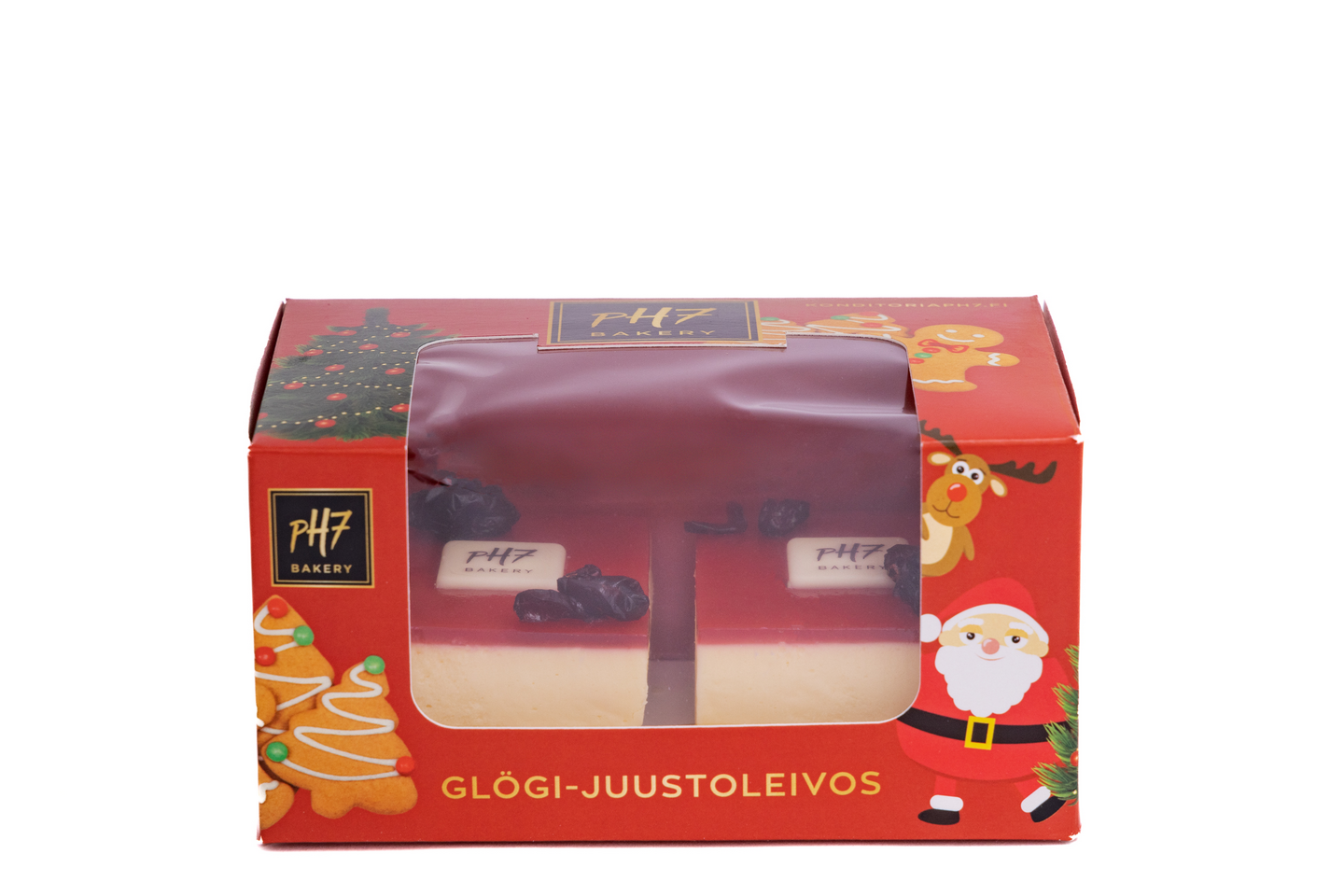 Konditoria pH7 tuo helpot mutta juhlavat tarjottavat pikkujouluihin tai joulun ajan kahvipöytään. Paistettu juustoleivos, jossa herkullinen piparkakku-keksipohja. Pehmeän juustomassan päällä raikasta glögikiillettä.