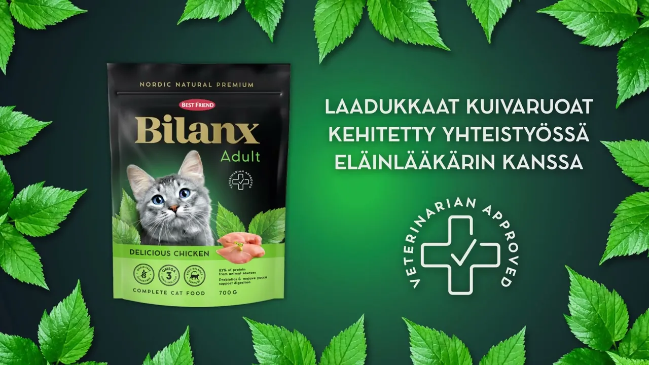 Kissa kertoo onnellisuutensa pienillä eleillä, innokkaalla ruokahalulla ja rennolla olemuksella. Laadukas ruoka on yksi tärkeimmistä tekijöistä kissan hyvinvoinnin taustalla, ja juuri se onkin pohjoismaisen Best Friend Bilanx kissanruokasarjan ydinajatus. Bilanx kissan kuiva- ja märkäruoat on kehitetty kissojen todellisiin tarpeisiin, siksi niissä ei ole mitään turhaa.