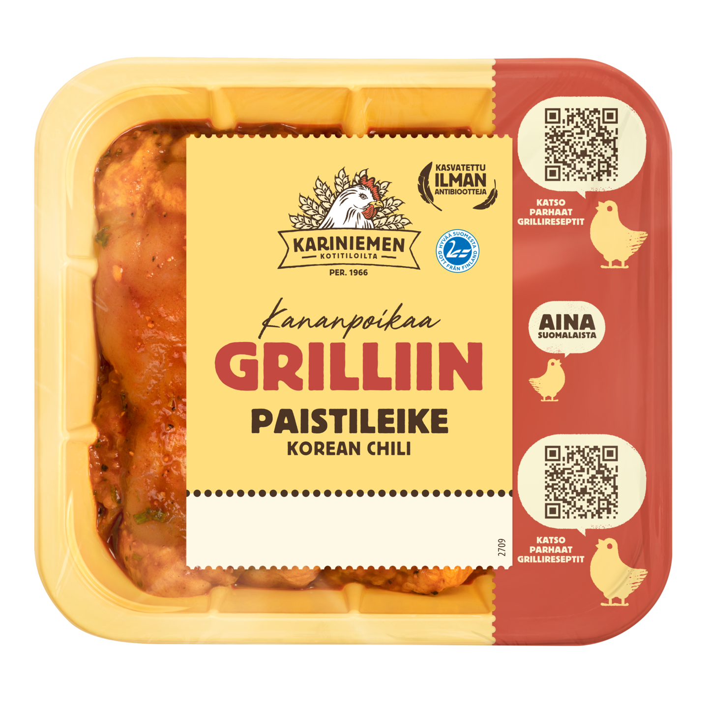 Kariniemen Kananpojan uudet herkulliset paistileikkeet ovat mehevää reisiosaa ja kestävät hyvin pitkää kypsennystä ja grillauksen kuumuutta. Koukuttavina makuina Cola BBQ sekä Korean Chili. Tietenkin suomalaisesta, ilman antibiootteja kasvatetusta kanasta!