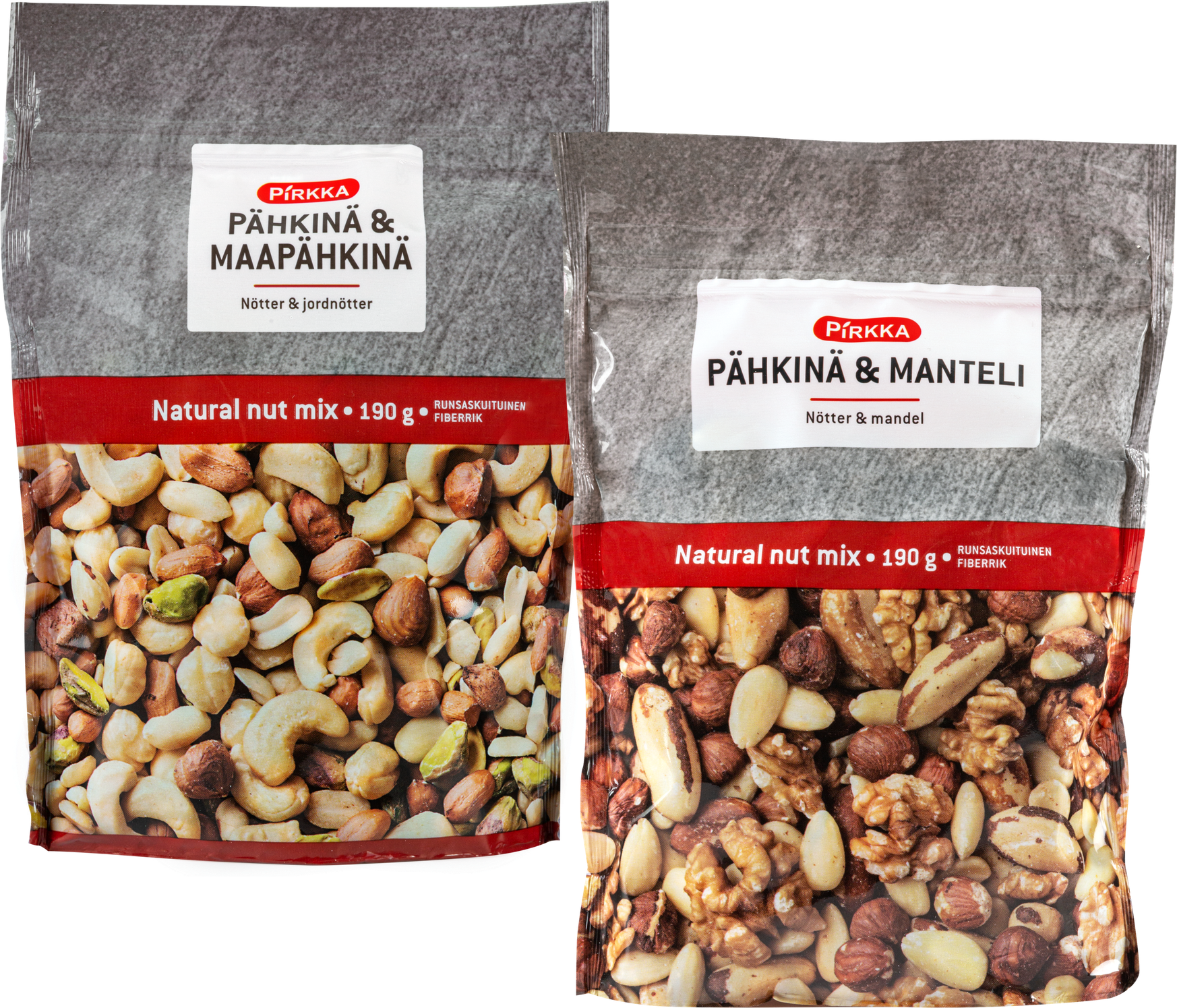 Pirkka pähkinä&manteli ja pähkinä&maapähkinä sekoitukset 190 g