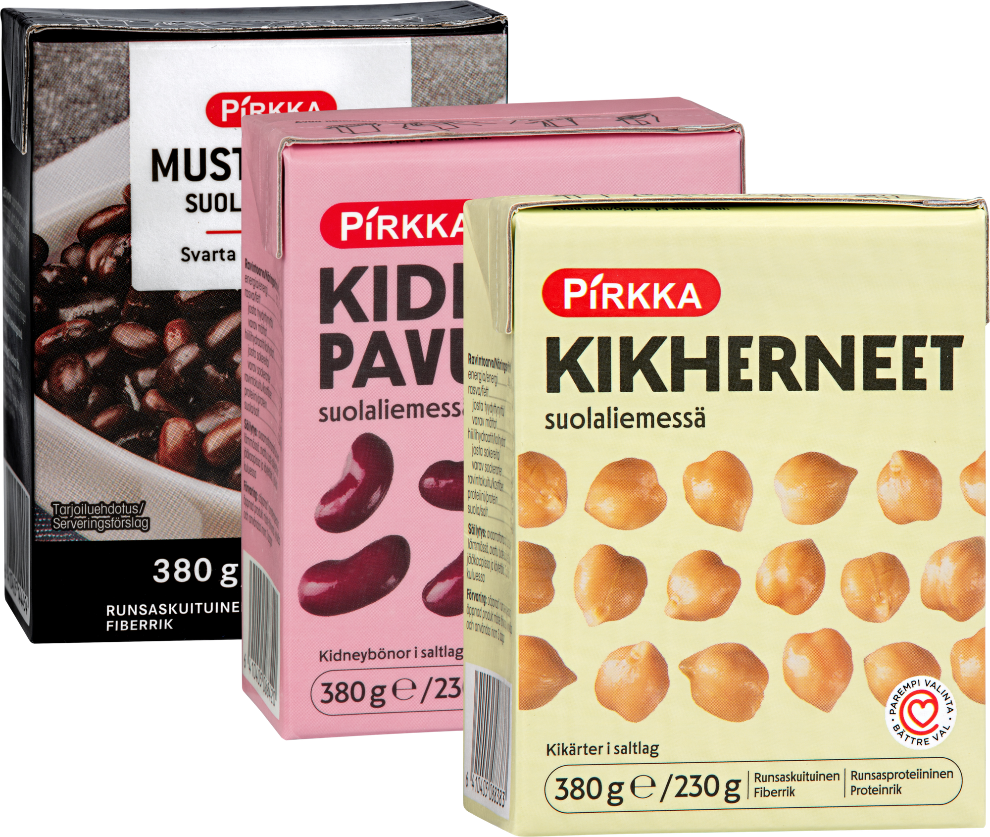 Pirkka pavut, kikherneet, linssit ja papusekoitus 380-390/230 g