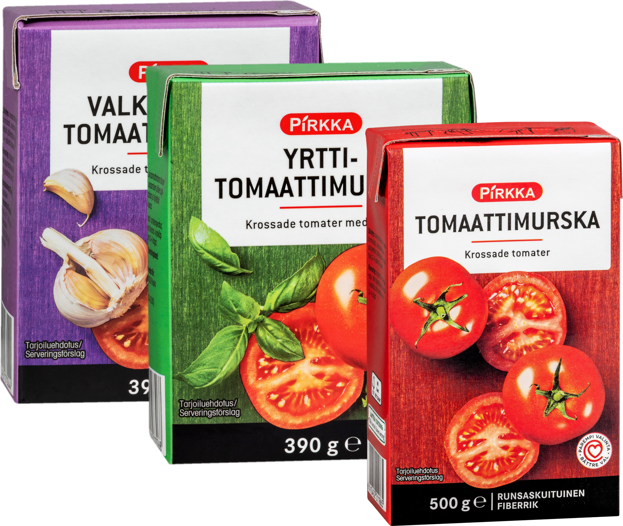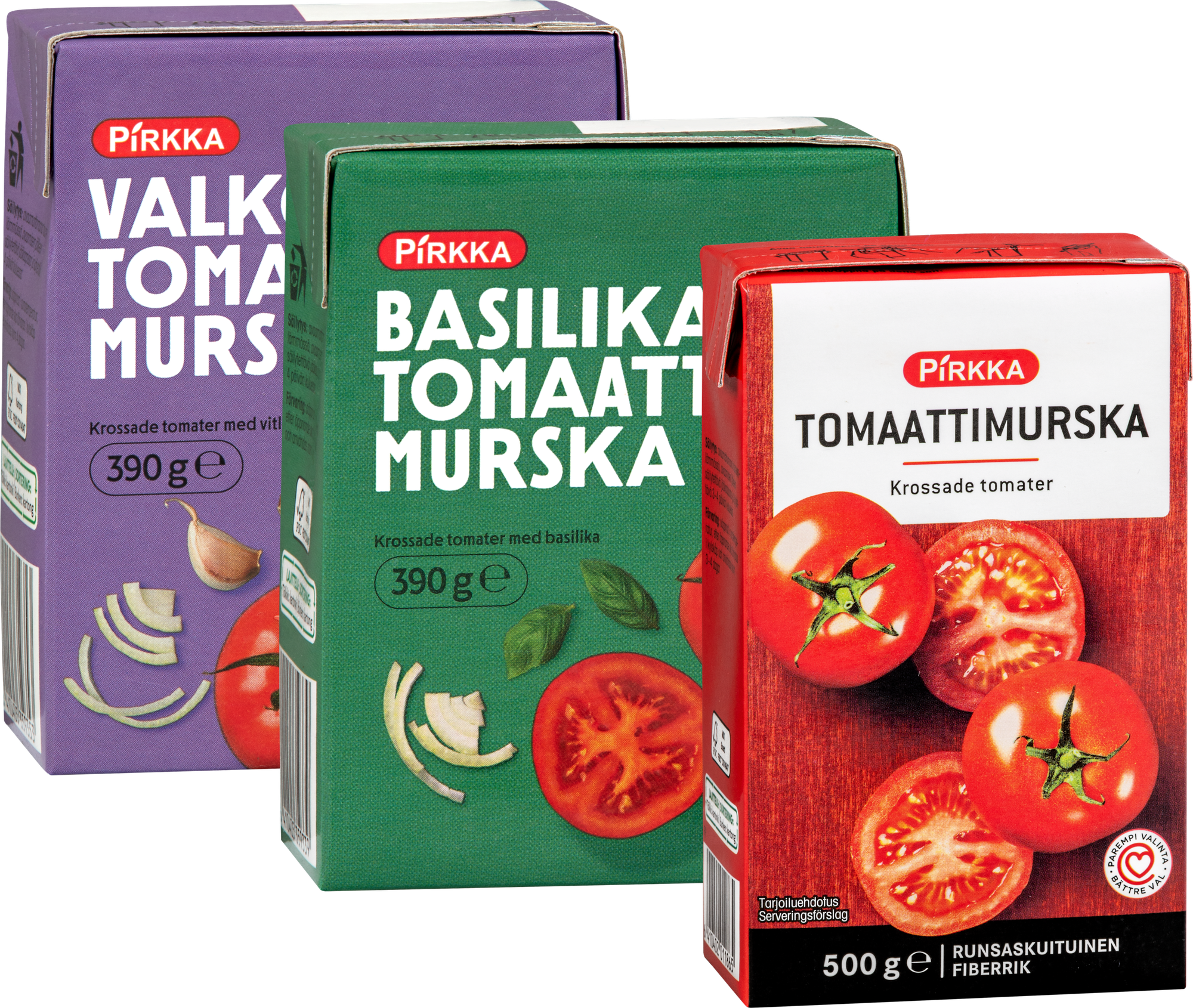 Pirkka maustetut tomaattimurskat 390 g ja tomaattimurska 500 g