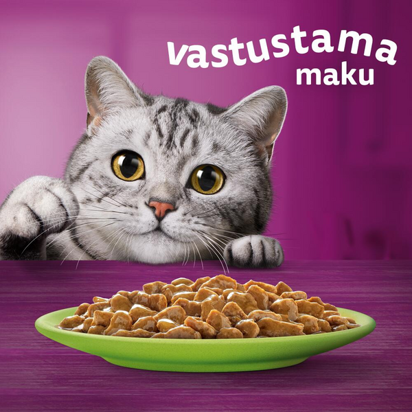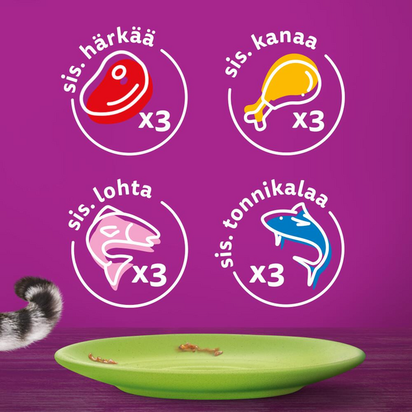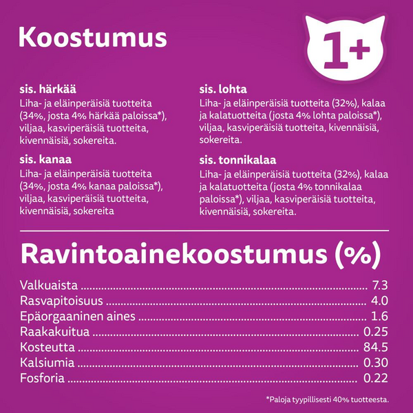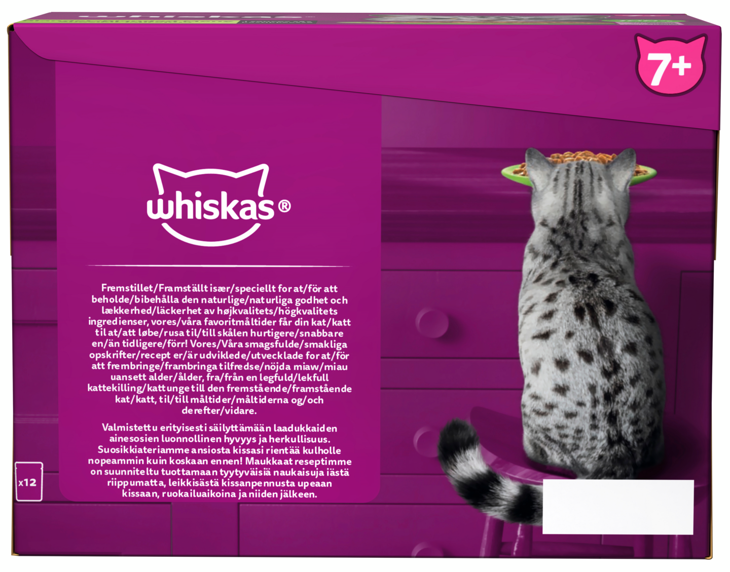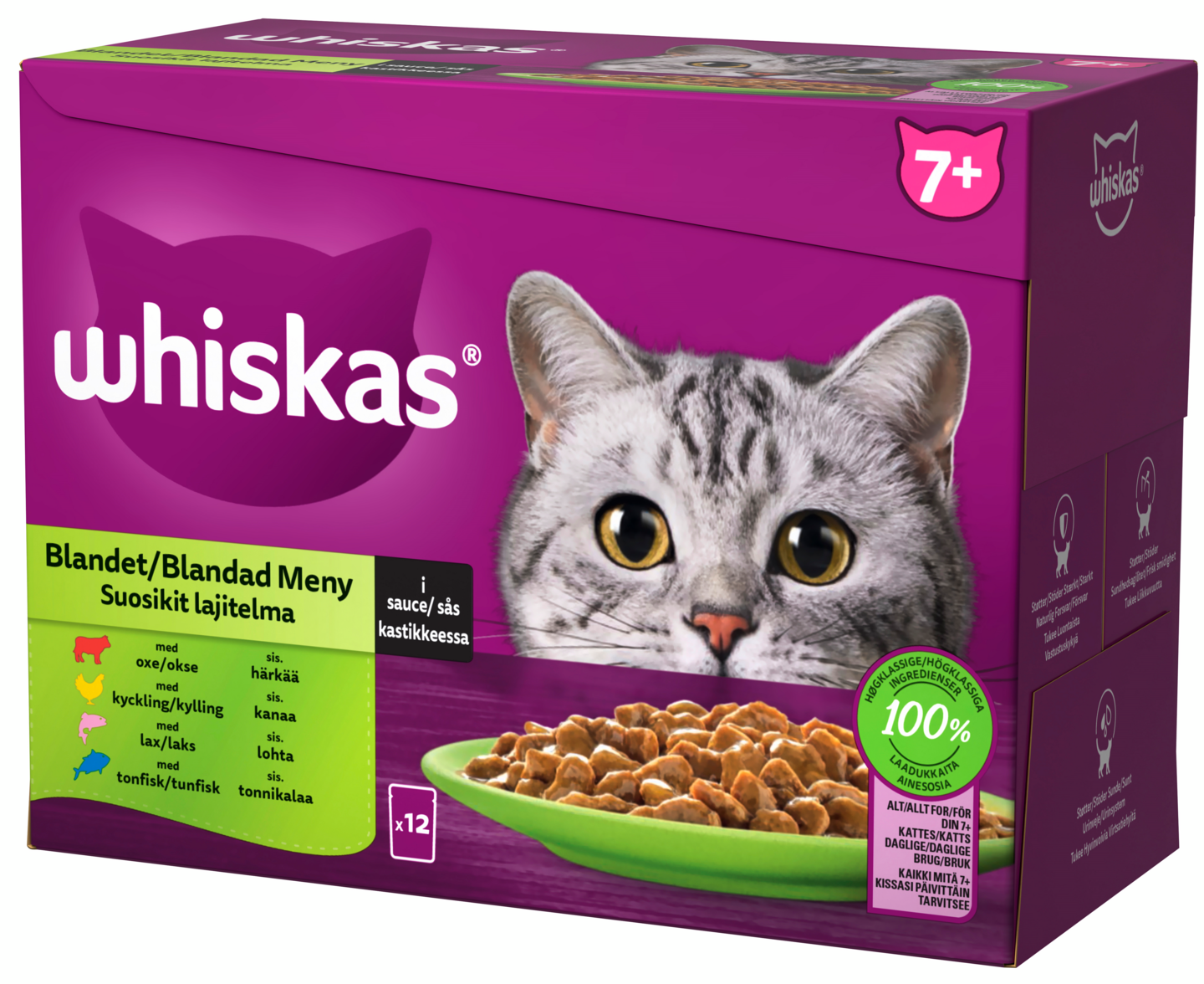 Whiskas 7+ kehitetty niin, että se sisältää oikean määrän ravintooineita kissasi muuttuviin tarpeisiin ja elinvoimaisuuden ylläpitämiseen. Lisätty E-vitamiini ja tauriini auttavat tukemaan luonnollista vastustuskykyä ja hyvinvoivaa sydäntä. Omega 6 -rasvahapot ja sinkki auttavat tukemaan ihon ja turkin hyvinvointia. Oikea fosforin määrä tukee munuaisten toimintaa. Kätevässä pakkauksessa on 12 aina tuoretta kerta-annosta, neljä erilaista makua, kutakin kolme pussia.