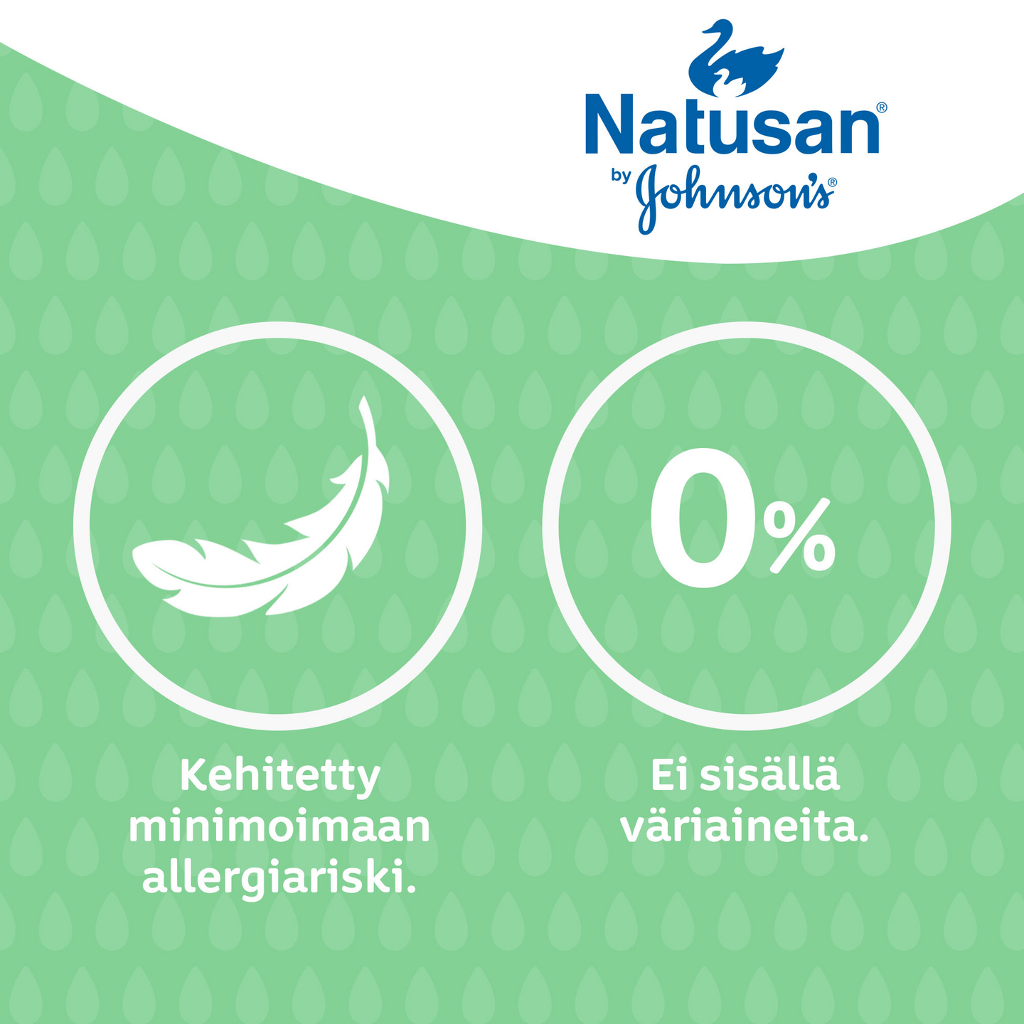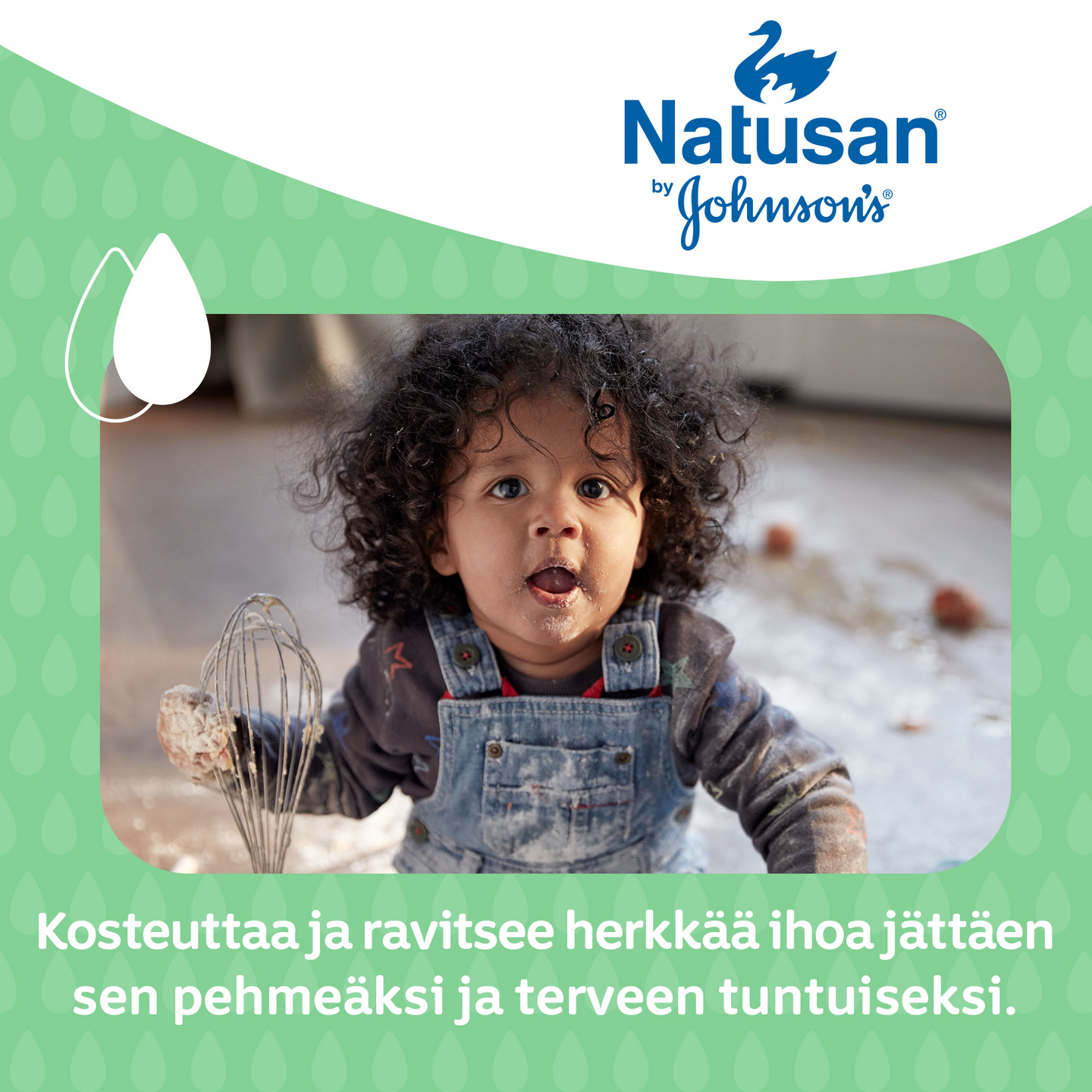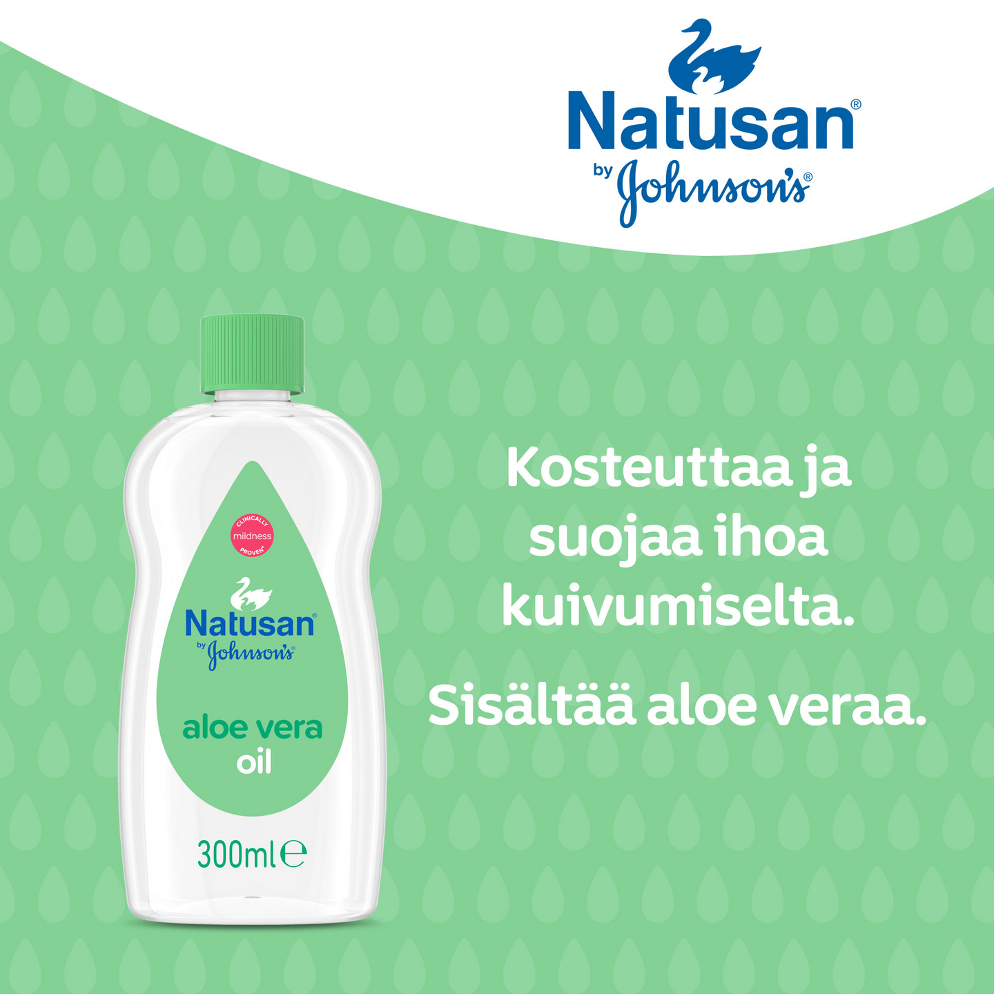 Natusan® by Johnson's® Oil Aloe Vera kosteuttaa välittömästi ja hoitaa herkkää ihoa jättäen iholle pehmeän ja raikkaan tunteen. Kosketus kehittää läheistä suhdetta vauvaan. Vauvan hierominen hoitoöljyllä kehittää läheistä suhdetta, ja se on rentouttavaa sekä vanhemmalle että vauvalle. Kehitetty minimoimaan allergiariski. Ei sisällä väriaineita. Täydellinen myös vanhemmille lapsille ja aikuisille!