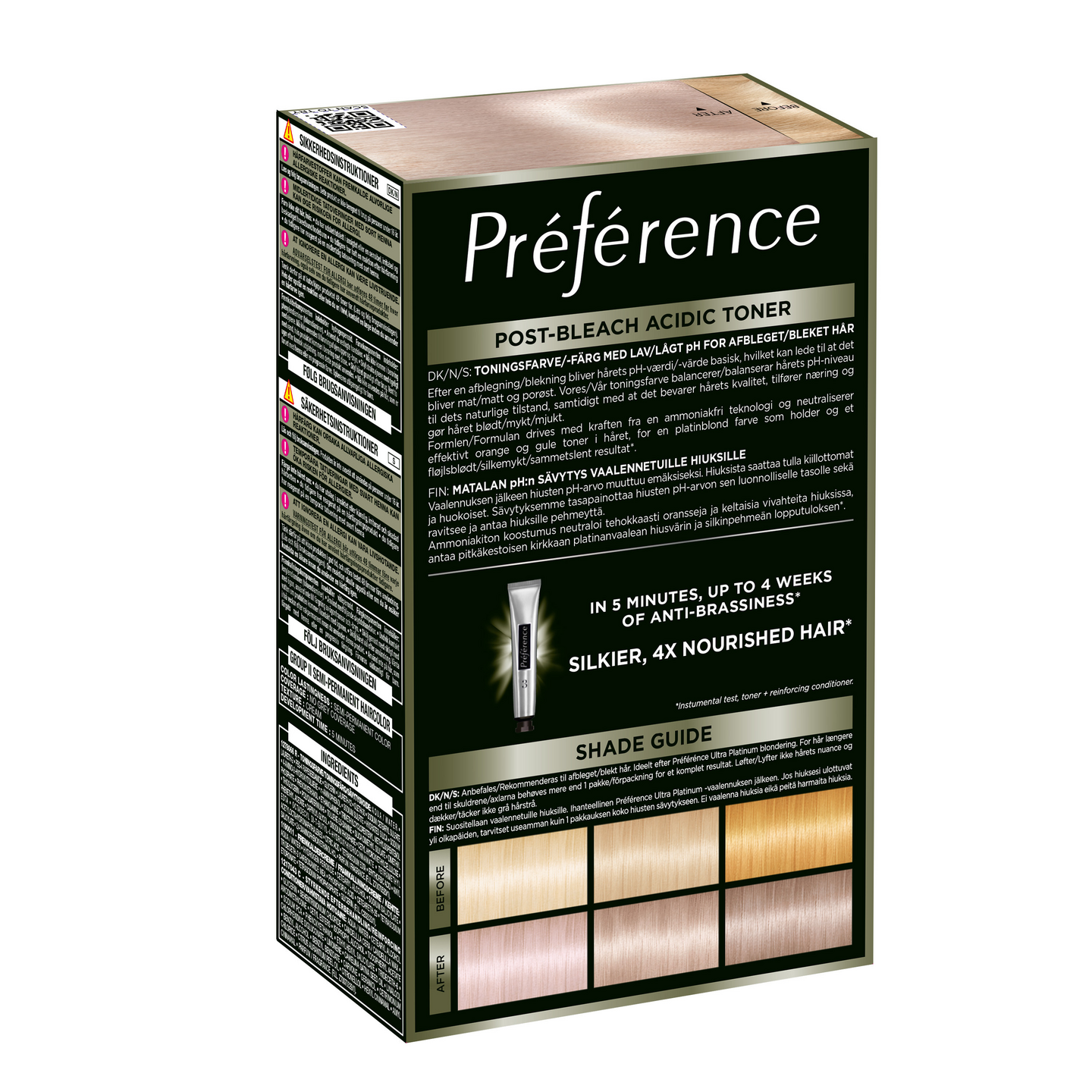 L'Oréal Paris Préférence täydentää vaalennusrutiinisi. Le Blonding Pearly Boost sävytys neutraloi vaalennettujen ja raidoitettujen hiusten lämpimiä sävyjä ja antaa kirkkaan vaalean hiusväri. Koostumus neutraloi keltaisia ja oransseja vivahteita jopa 4 viikon ajan*, tekee hiuksista silkinpehmeät ja antaa niille 4 kertaa enemmän ravitsevuutta*. Préférence Le Blonding Pearly Boost ammoniakiton koostumus palauttaa hiusten pH-arvon luonnolliselle tasolle ja tekee hiusten laadusta paremman – vain 5 minuutissa. • Neutraloi lämpimiä sävyjä • Neutraloi keltaisia ja oransseja vivahteita jopa 4 viikon ajan* • Tekee hiusten laadusta paremman • Palauttaa hiusten pH-arvon • Ei sisällä ammoniakkia miellyttävän tuoksun aikaansaamiseksi Pakkaus sisältää: 1 sävytysvoiteen, 1 kehitteen, 1 vahvistavan hoitoaineen, 1 parin suojakäsineitä + käyttöohjeet- *Mittaustulos, sävytys + vahvistava hoitoaine