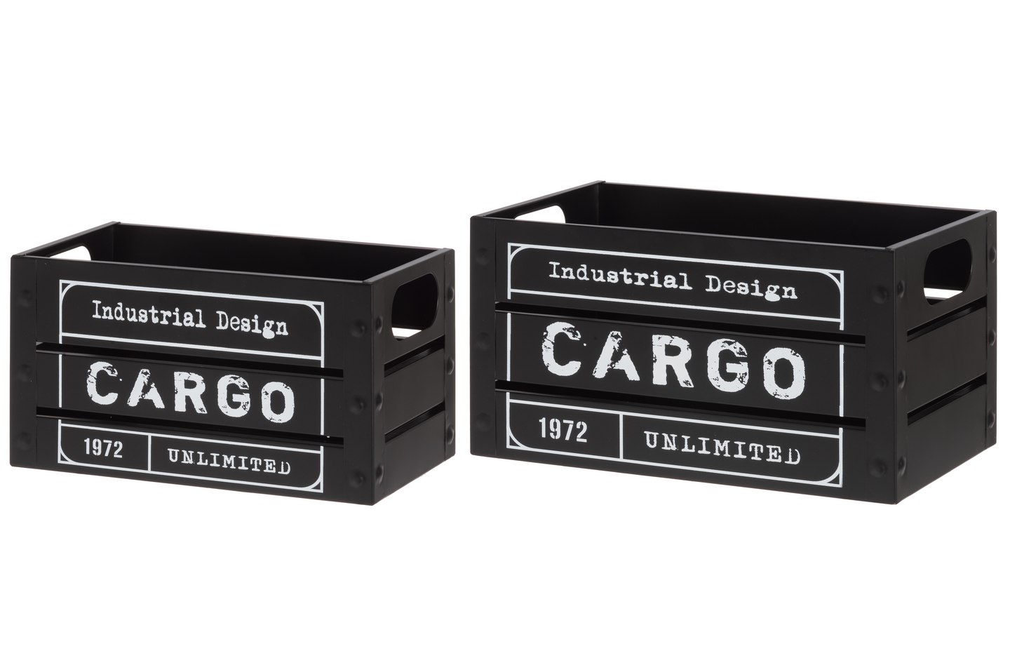 Mustassa metallilaatikossa on kätevät upotetu kantokahvat helpottamassa siirtelyä. Laatikossa on valkoisella tekstit: Industrial Design, Cargo, 1972 Unlimited. Laatikon leveys on 31,3 cm syvyys 18,3 cm ja korkeus 16 cm.