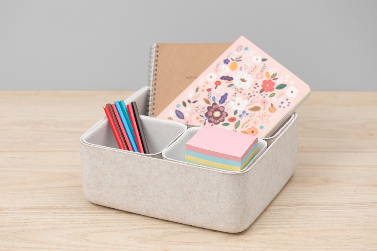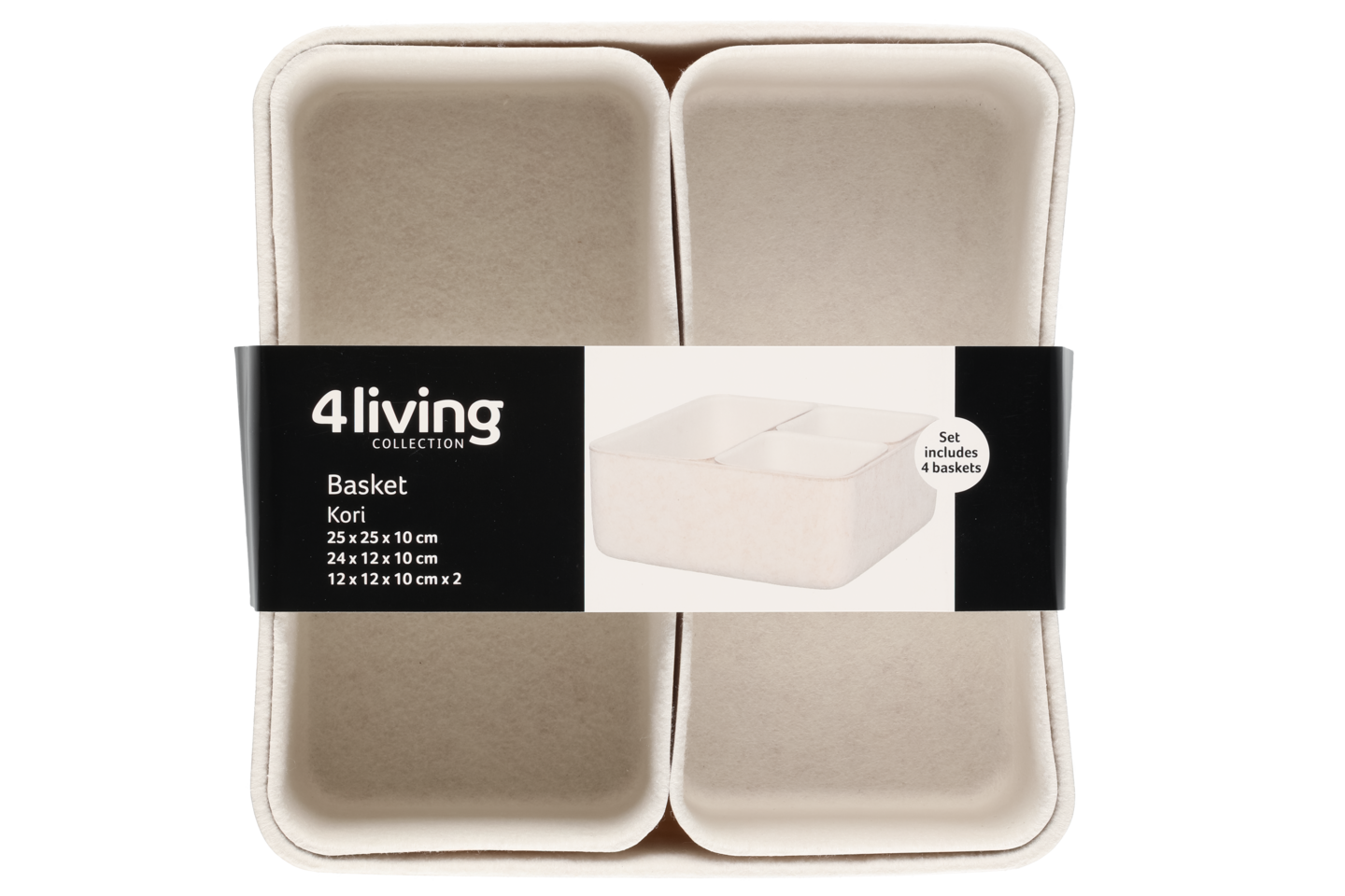 Järjestystä ja harmoniaa työpöydälle, hyllyille ja kaappeihin käytännöllisten järjestelijöiden avulla. Korit on valmistettu huovasta, joten ne eivät myöskään kolise liikuteltaessa. Sisältää 4 koria, 2 kpl 12 x 12 x 10 cm, 24 x 12 x 10 cm sekä 25 x 25 x 10 cm. Materiaali: 100 % polyesteri. Väri beige-valkoinen.