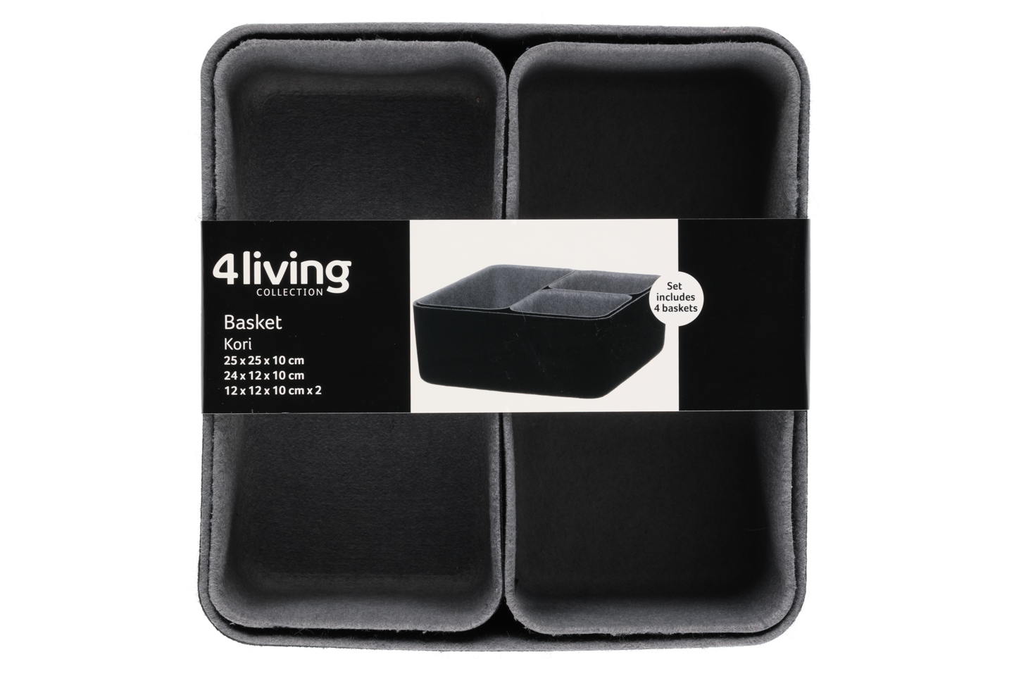 Järjestystä ja harmoniaa työpöydälle, hyllyille ja kaappeihin käytännöllisten järjestelijöiden avulla. Korit on valmistettu huovasta, joten ne eivät myöskään kolise liikuteltaessa. Sisältää 4 koria, 2 kpl 12 x 12 x 10 cm, 24 x 12 x 10 cm sekä 25 x 25 x 10 cm. Materiaali: 100 % polyesteri.