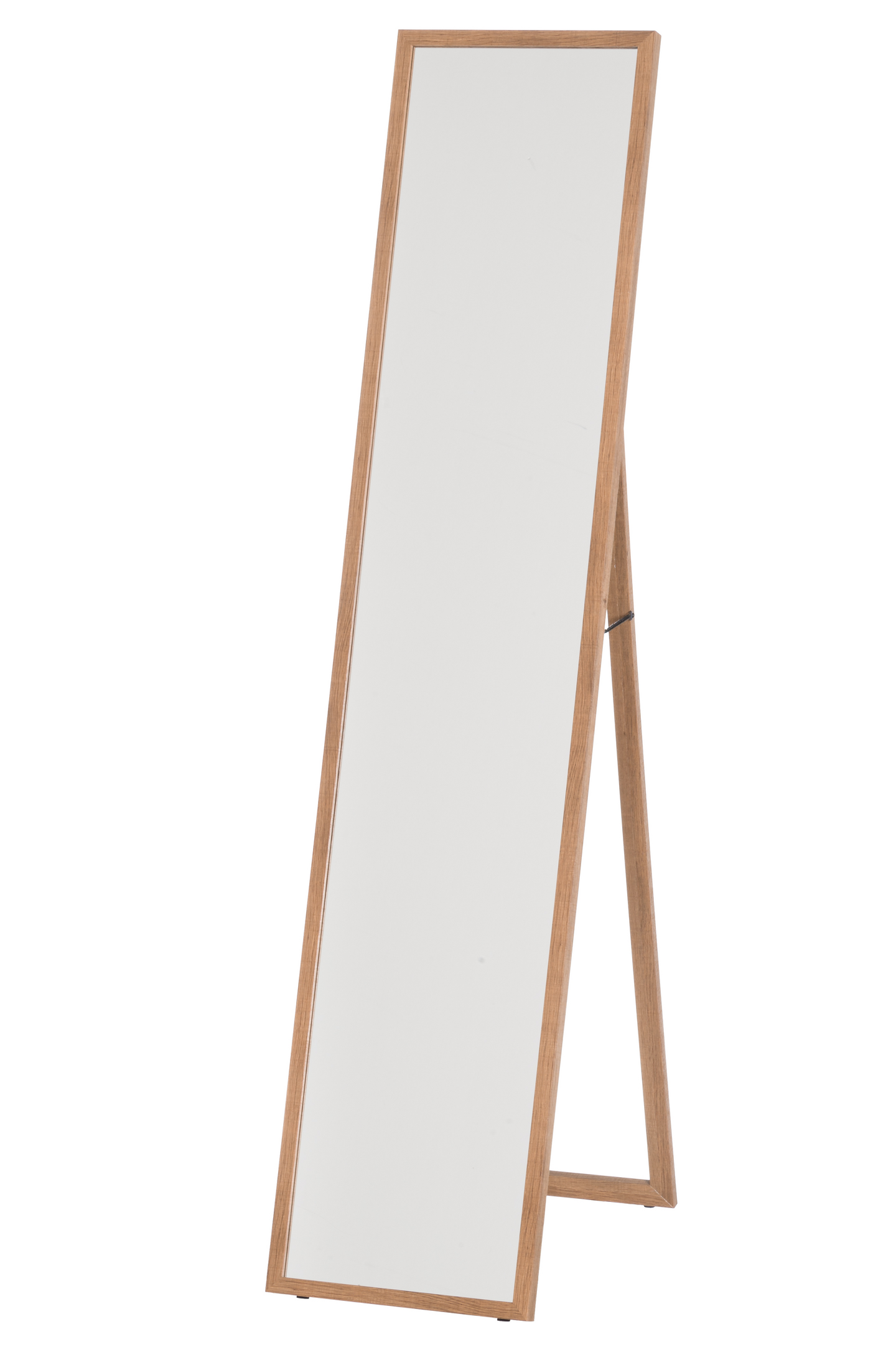 Lattiapeili puukehyksellä. Omalla jalallaan seisova peili on helppo siirtää tilasta toiseen tarpeen mukaan. Materiaali: kehys ja seisomatuki MDF, peili 3 mm lasia, johon sekoitettu alumiinia, tausta aaltopahvia ja paperia.