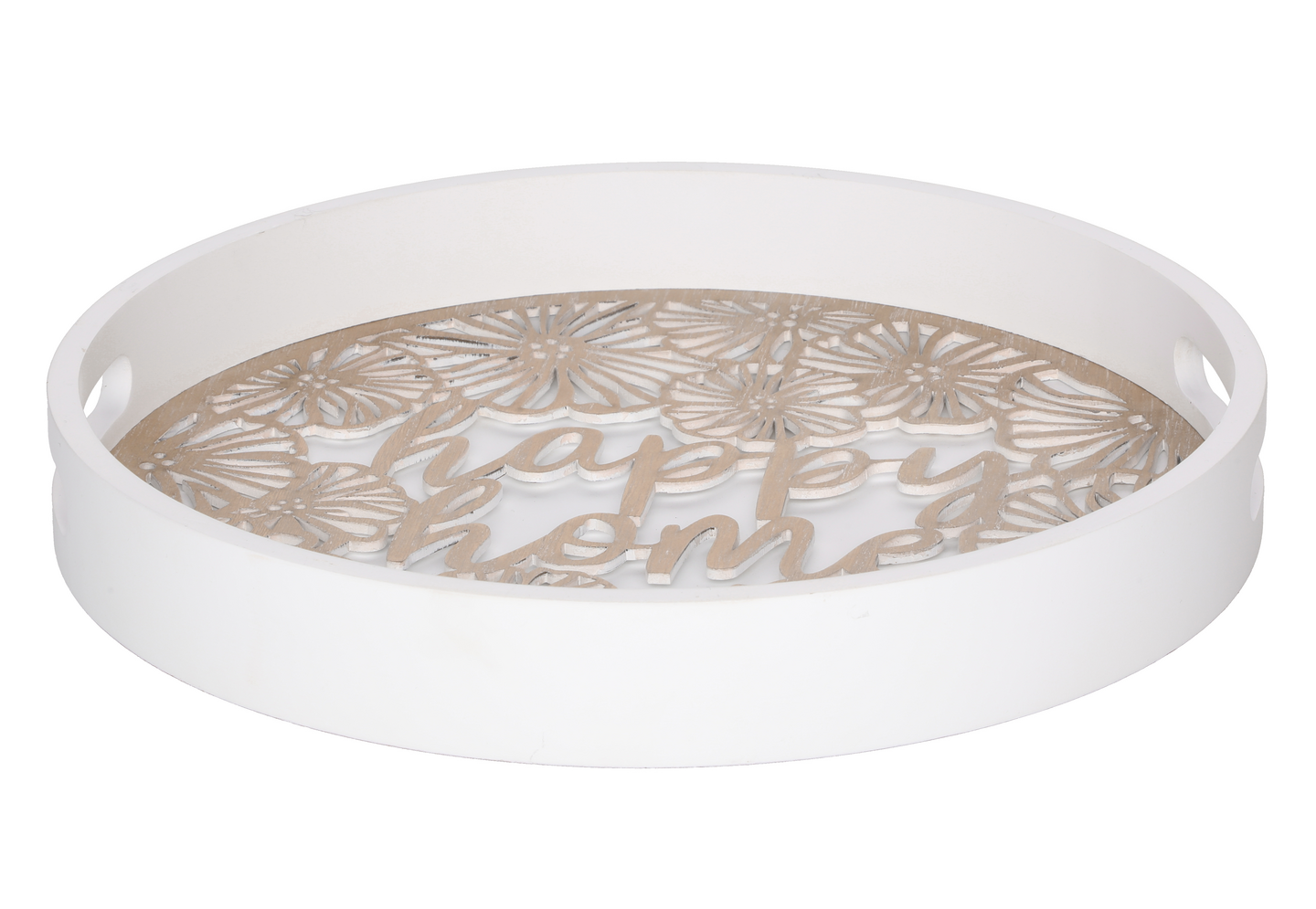 Kaunis valkoinen tarjotin puunvärisellä pohjakuvioinnilla ja kantokahvoilla. Materiaali: MDF.