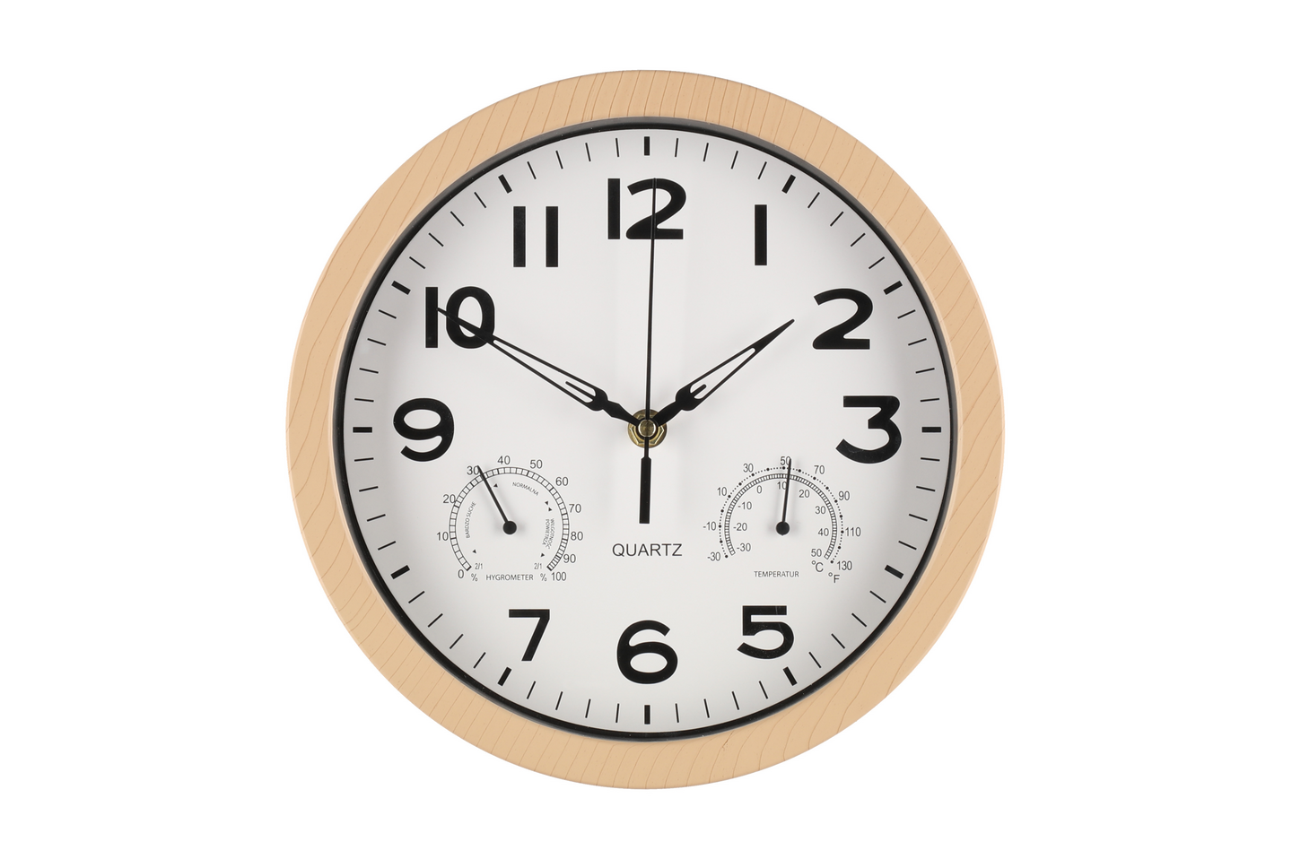 4Living Vita seinäkellossa on puun näköiset paksut kehykset, valkoinen kellotaulu, mustat selkeät numerot sekä lämpötilamittari ja kosteusmittari.