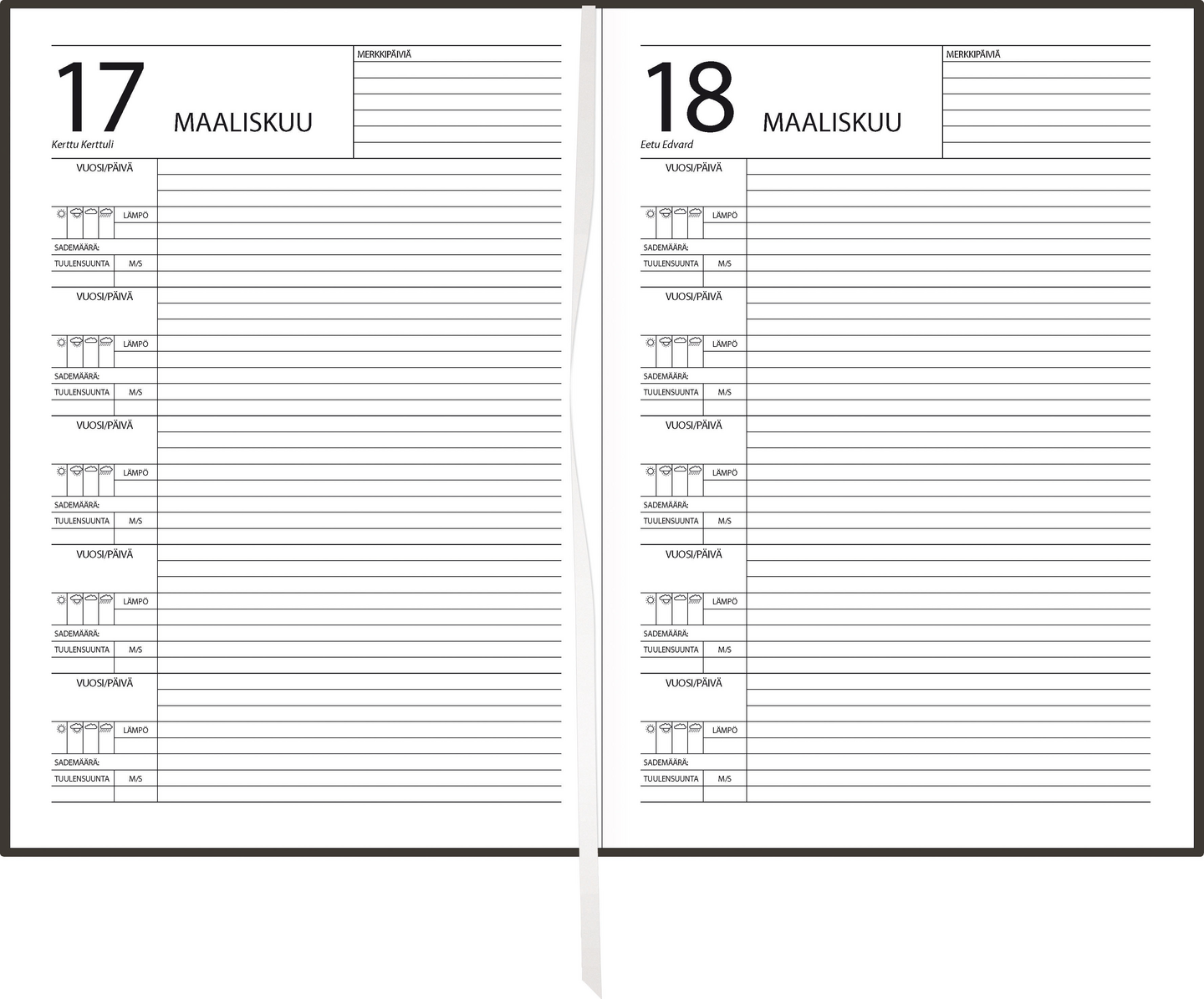 Viisi vuotta muistiin, aloita koska vaan. Koko 148 x 210 mm (A5); sidottu; päiväämätön; yksi päivä viideksi seuraavaksi vuodeksi; merkitse itse vuosiluku ja viikonpäivä; suomalaiset nimipäivät; runsaasti muistiinpanotilaa; FSC®-sertifioitu tuote.