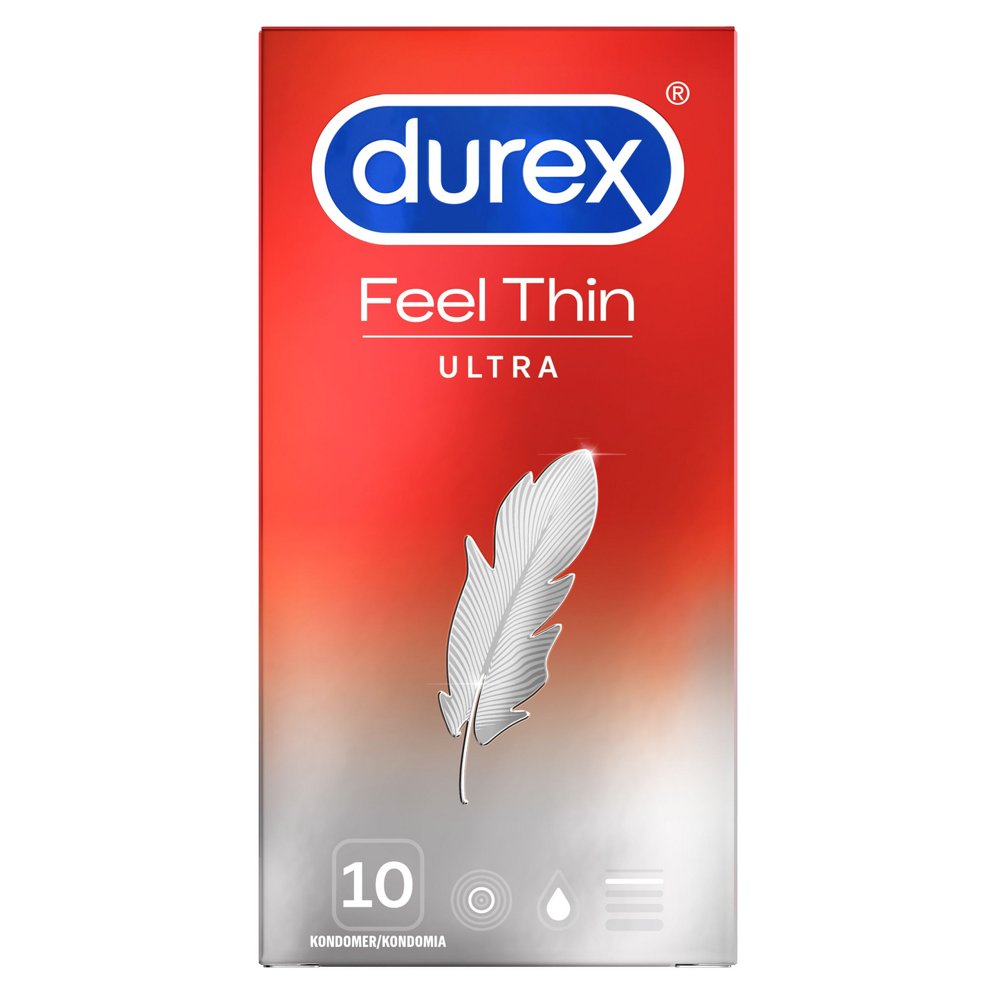 SUOSIKKIKONDOMISI UUDESSA PAKKAUKSESSA: Suosikkikondomisi ovat nyt uudessa pakkauksessa, jossa uusi raikas ilme. Ei huolta – sisältö on edelleen sama. Durex Thin Feel, Ultra Thin -kondomit lisäävät sinun ja kumppanisi tuntoherkkyyttä – tinkimättä turvallisuudesta ja suojaavuudesta, jota voit odottaa Durexilta. Kondomit on valmistettu ultraohuesta lateksista ja suunniteltu vielä ohuemmiksi, jotta tuntisit vielä enemmän. Kondomien nimellisleveys on 54 mm, ja ne on päällystetty silikonipohjaisella liukuvoiteella. Läpinäkyvissä, sylinterinmuotoisissa lateksikondomeissa on päässä säiliö, joten ne on helppo rullata paikalleen, ja niissä on parempi istuvuus seksin aikana.