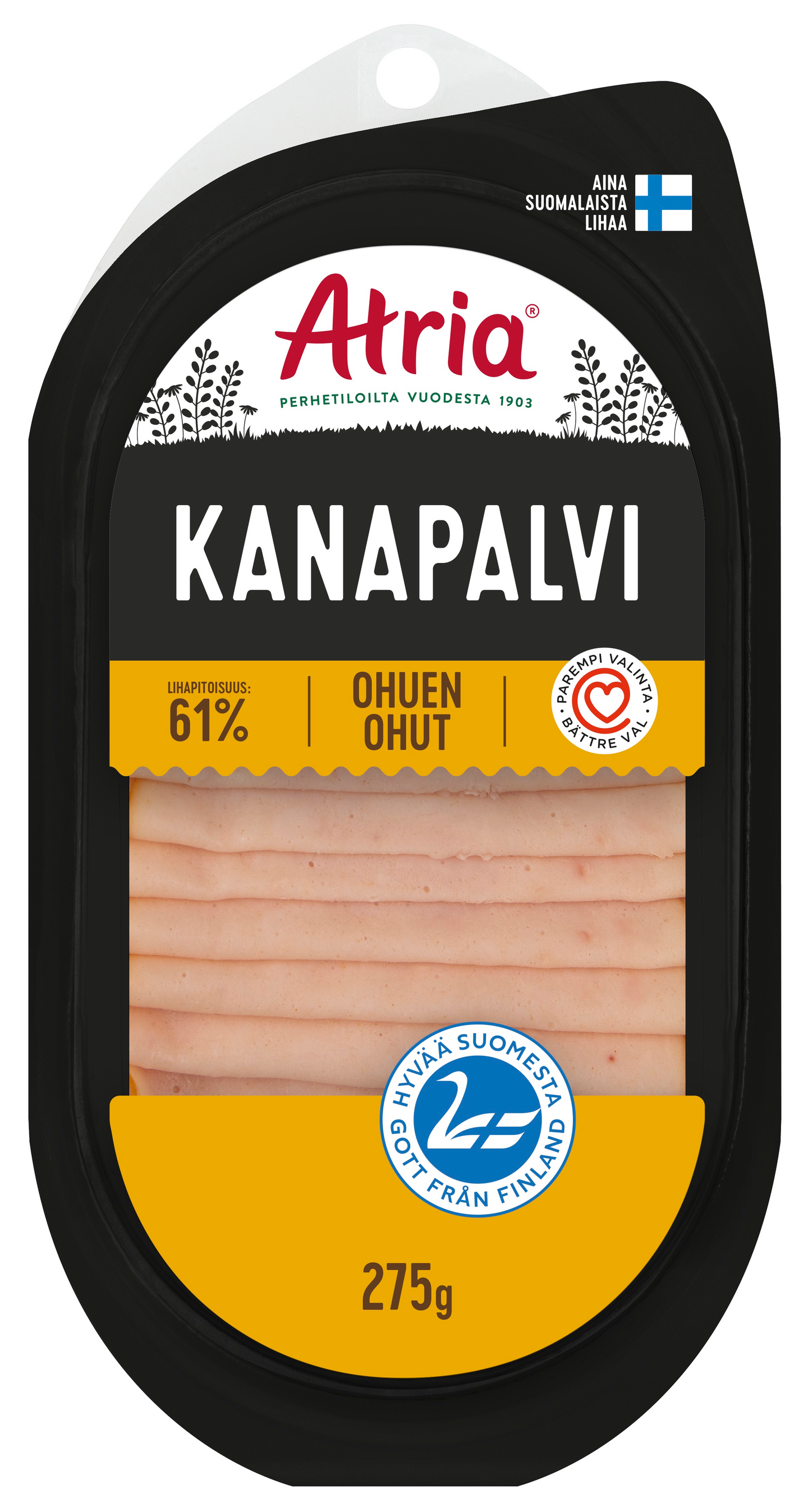 Suomalaisesta kanasta miedosti savustettu ohuen ohut leikkele. Atria Ohuen Ohut Kanapalvi sopii erinomaisesti kevyeksi vaihtoehdoksi leivän päälle, mutta myös salaatteihin, täytteeksi esimerkiksi tortillakääröihin tai tarjottavaksi voileipäkakun päällä.
