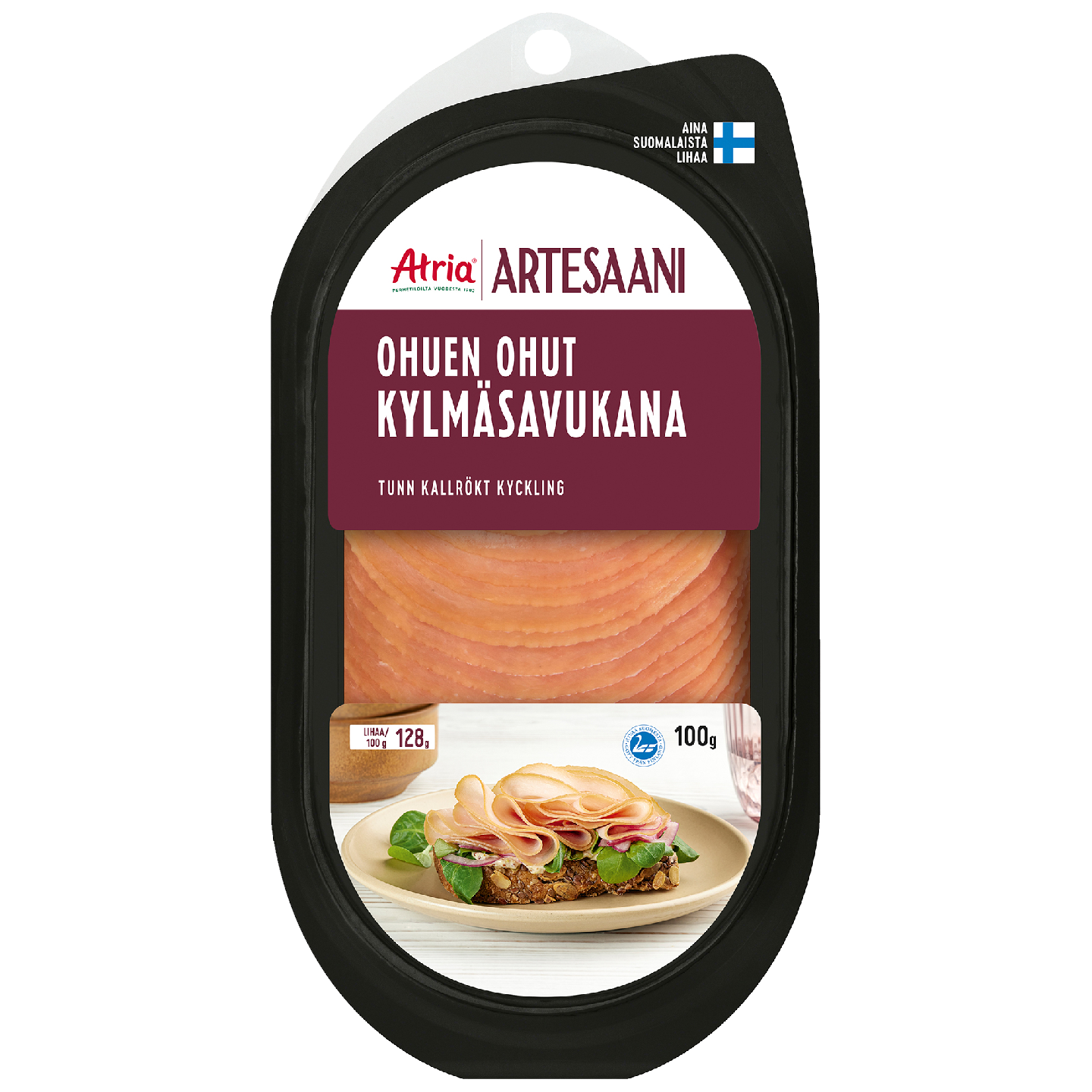 Atria Artesaani Ohuen Ohut Kylmäsavukana on kylmäsavustettu herkutteluviipale suomalaisesta broilerista. Atria Artesaani Ohuen Ohut Kylmäsavukana on kasvatettu vastuullisesti ja broilerit on ruokittu rehulla, joka sisältää 35 % kauraa.