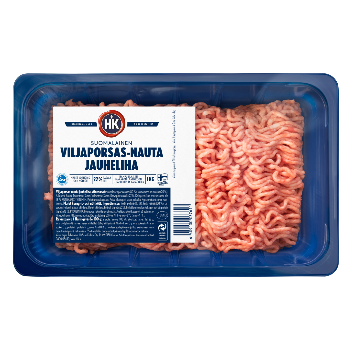 Korkealaatuista suomalaista HK viljaporsas-nauta jauhelihaa, joka sopii käytettäväksi monenlaisiin jauheliharuokiin, kuten makaronilaatikkoon, kaalilaatikkoon ja jauhelihakastikkeeseen. Viljaporsas-nauta jauhelihassa on rasvaa 22%. Riittoisa 1 kg pakkaus. Nauti lihasta osana monipuolista ruokavaliota. Viljaporsas-nautajauheliha on luontaisesti hyvä B12-vitamiinin ja sinkin lähde. Tuote on valmistettu suomalaisilla tiloilla vastuullisesti kasvatetusta viljaporsaan ja naudan lihasta. Lajittele pakkaus käytön jälkeen muovina.