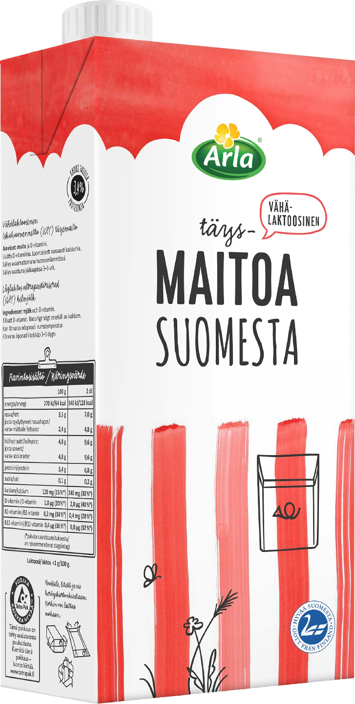Arla vähälaktoosinen täysmaito Suomesta (UHT) on valmistettu Suomessa suomalaisesta maidosta. Maitojuoma on monipuolinen ravintoaineiden lähde. Maito sisältää runsaasti proteiinia ja kalsiumia, jonka imeytymistä parannetaan lisäämällä maitojuomaan D-vitamiinia. Vähälaktoosinen täysmaito soveltuu erityisesti leivontaan ja ruoanlaittoon sekä kahviin. Rasvaa 3,5%. UHT-maitojuoma voidaan säilyttää avaamattomana huoneenlämmössä, minkä ansiosta se sopiikin hyvin esimerkiksi mökille.