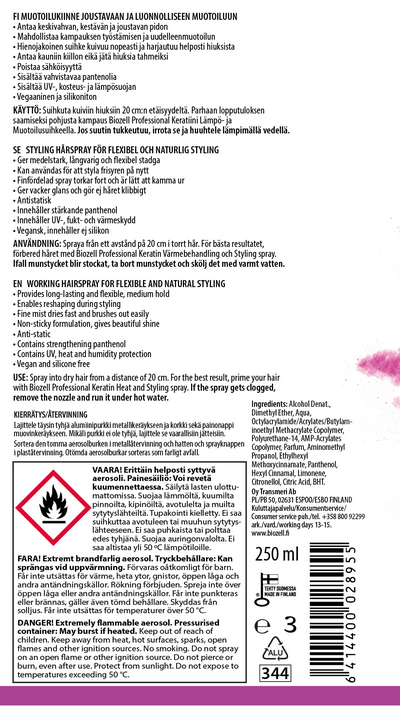 Muotoilukiinne joustavaan ja luonnolliseen muotoiluun. Antaa hiuksiin keskivahvan, kestävän ja joustavan pidon. Mahdollistaa kampauksen työstämisen ja uudelleenmuotoilun. Hienojakoinen suihke kuivuu nopeasti ja harjautuu helposti hiuksista. Antaa kauniin kiillon eikä jätä hiuksia tahmeiksi. Sisältää UV-, kosteus- ja lämpösuojan. Sisältää vahvistavaa pantenolia. Vegaaninen ja silikoniton. Valmistettu Suomessa.