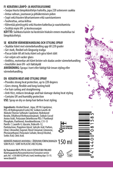 Suojaa hiusta lämpökäsittelyn haitoilta, jopa 220 asteeseen saakka. Antaa vahvan, joustavan ja pitkäkestoisen pidon. Sopii sekä hiusten kihartamiseen että suoristamiseen. Tuuheuttaa, antaa kiiltoa. Vähentää pörröisyyttä sekä hiusten katkeilua ja vaurioitumista. Sisältää myös UV- ja kosteussuojan. Valmistettu Suomessa.