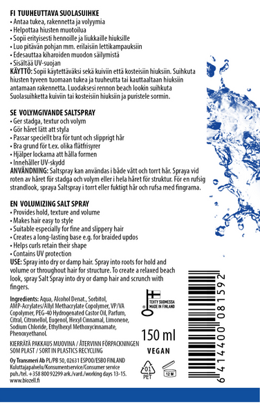 Antaa tukea, rakennetta ja volyymia. Helpottaa hiusten muotoilua. Sopii erityisesti hennoille ja liukkaille hiuksille. Luo pitävän pohjan mm. erilaisiin lettikampauksiin. Edesauttaa kiharoiden muodon säilymistä. Sisältää UV-suojan. Vegaaninen. Valmistettu Suomessa.