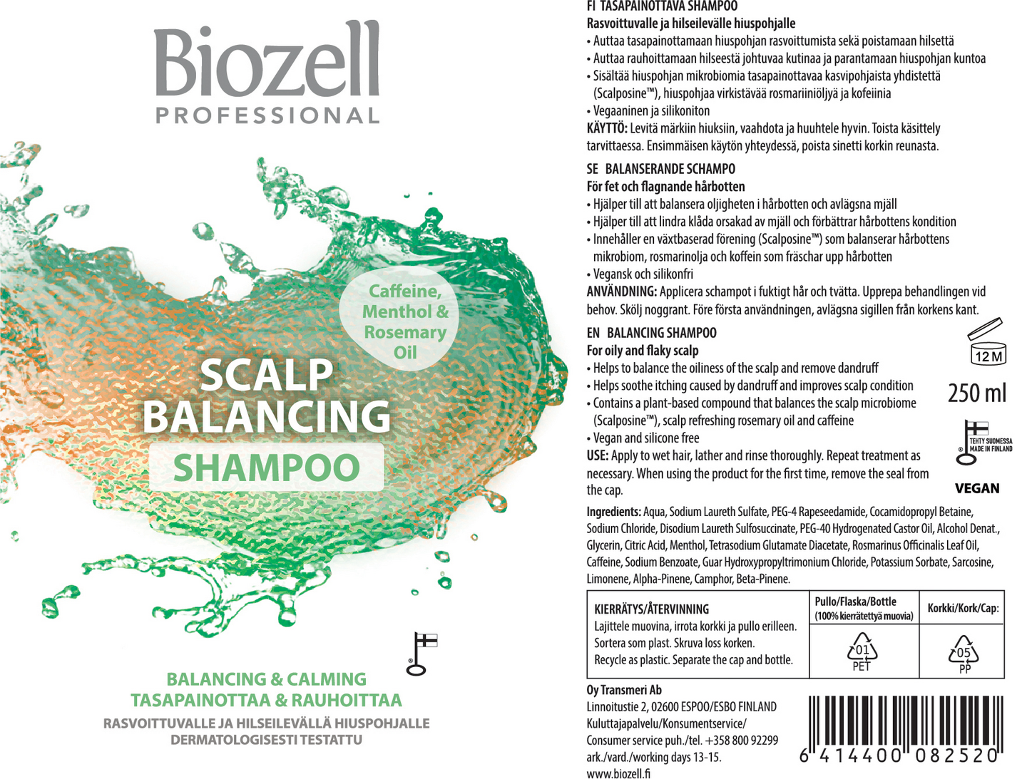 Auttaa tasapainottamaan hiuspohjan rasvoittumista sekä poistamaan hilsettä, rauhoittamaan hilseestä johtuvaa kutinaa ja parantamaan hiuspohjan kuntoa. Sisältää hiuspohjan mikrobiomia tasapainottavaa kasvipohjaista yhdistettä (Scalposine®), hiuspohjaa virkistävää rosmariiniöljyä ja kofeiinia. Poistaa hilsettä, rauhoittaa kutinaa. Vegaaninen ja silikoniton koostumus. Virkistävä mentolin ja rosmariinin tuoksu. Valmistettu Suomessa.