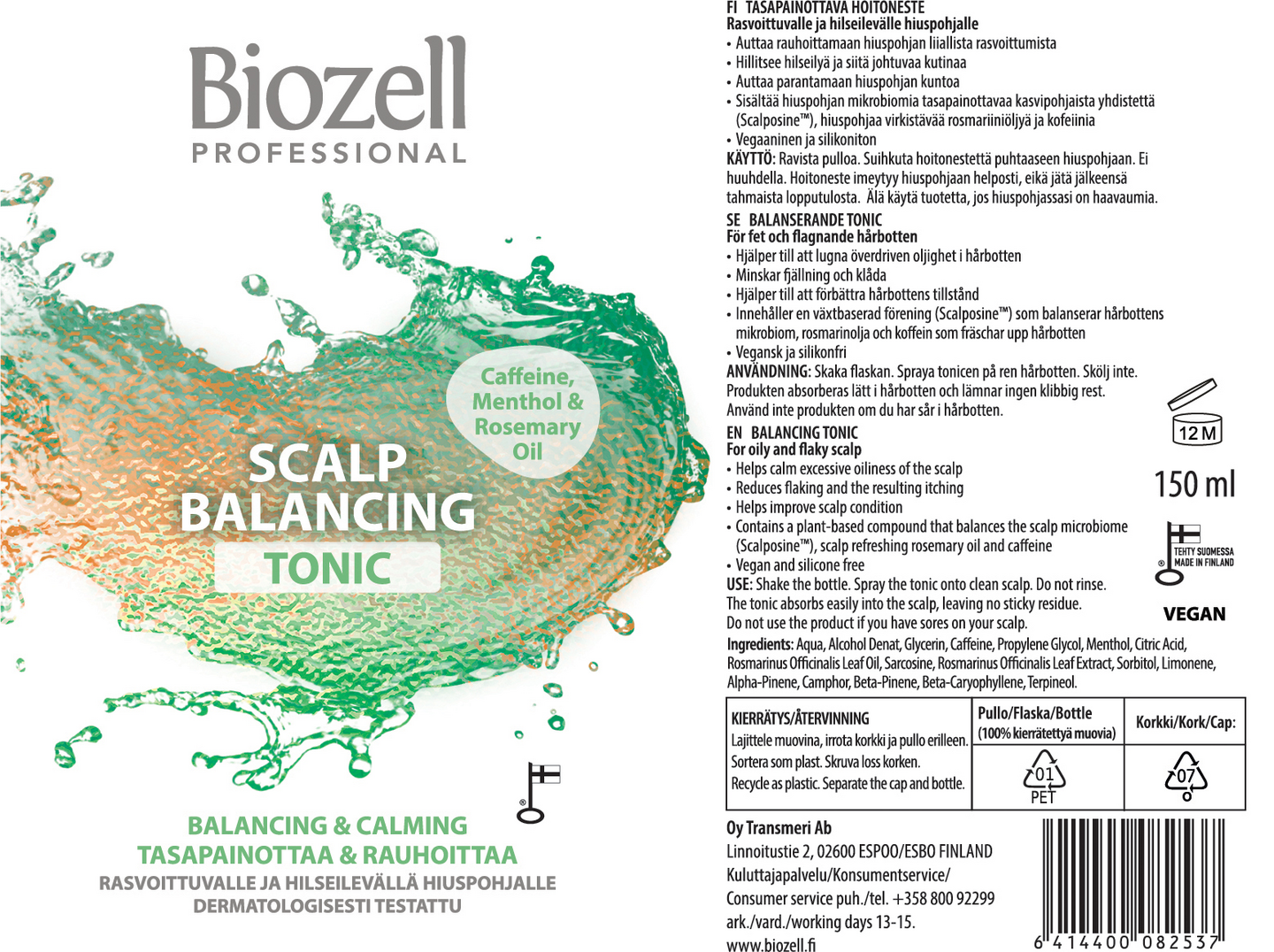 Auttaa tasapainottamaan rasvoittuvaa hiuspohjaa, hillitsee kutinaa ja hilseilyä. Sisältää hiuspohjan mikrobiomia tasapainottavaa kasvipohjaista yhdistettä (Scalposine®), hiuspohjaa virkistävää rosmariiniöljyä ja kofeiinia. Sopii päivittäiseen käyttöön. Vegaaninen ja silikoniton koostumus. Valmistettu Suomessa.