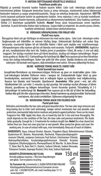 HOITAVA SÄVYTENAAMIO VÄRJÄTYILLE HIUKSILLE. Pastellinen pinkki sävy. Ylläpitää ja syventää hiusväriä tuoden hiuksiin kauniin kiillon. Color Lock -teknologia säilyttää sävyn intensiivisenä pitkään. Katajauute kosteuttaa hiusta ja antaa värisuojaa, niasiiniamidi auttaa lukitsemaan kosteuden hiukseen ja suojaa ympäristönsaasteilta. Sävyjä voi sekoittaa keskenään. Hajusteeton.