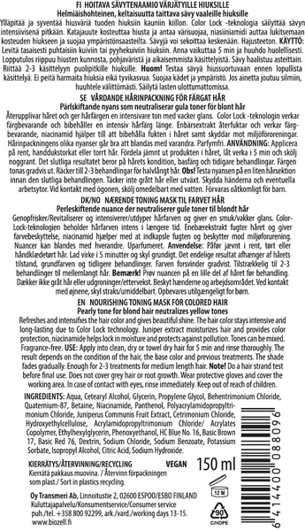 HOITAVA SÄVYTENAAMIO VÄRJÄTYILLE HIUKSILLE. Helmiäishohteinen, keltaisuutta taittava sävy vaaleille hiuksille. Ylläpitää ja syventää hiusväriä tuoden hiuksiin kauniin kiillon. Color Lock -teknologia säilyttää sävyn intensiivisenä pitkään. Katajauute kosteuttaa hiusta ja antaa värisuojaa, niasiiniamidi auttaa lukitsemaan kosteuden hiukseen ja suojaa ympäristönsaasteilta. Sävyjä voi sekoittaa keskenään. Hajusteeton.