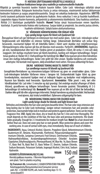 HOITAVA SÄVYTENAAMIO VÄRJÄTYILLE HIUKSILLE. Vaalean hiekkainen beige sävy vaaleille ja vaaleanruskeille hiuksille. Ylläpitää ja syventää hiusväriä tuoden hiuksiin kauniin kiillon. Color Lock -teknologia säilyttää sävyn intensiivisenä pitkään. Katajauute kosteuttaa hiusta ja antaa värisuojaa, niasiiniamidi auttaa lukitsemaan kosteuden hiukseen ja suojaa ympäristönsaasteilta. Sävyjä voi sekoittaa keskenään. Hajusteeton.